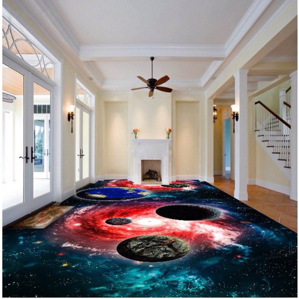 Description: A living room with a large carpet with a painting on it and a ceiling fan in the center of the room.