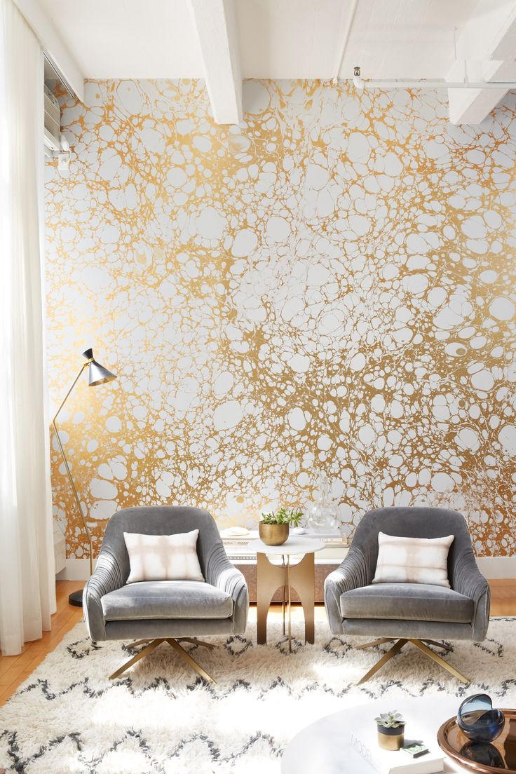 Description: A living room with two chairs and a rug on the floor and a wall with a gold paint design.