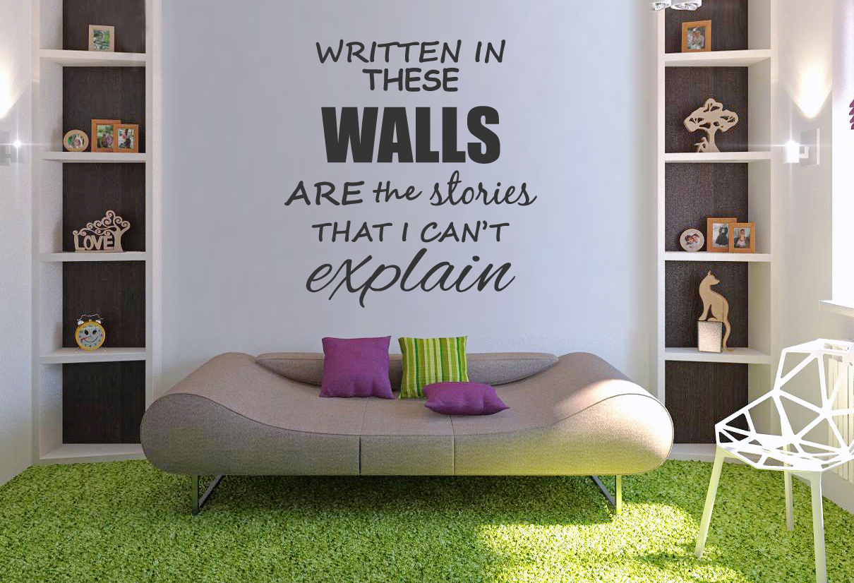 Description: A living room with a couch and a book shelf on the wall and a quote on the wall above it.