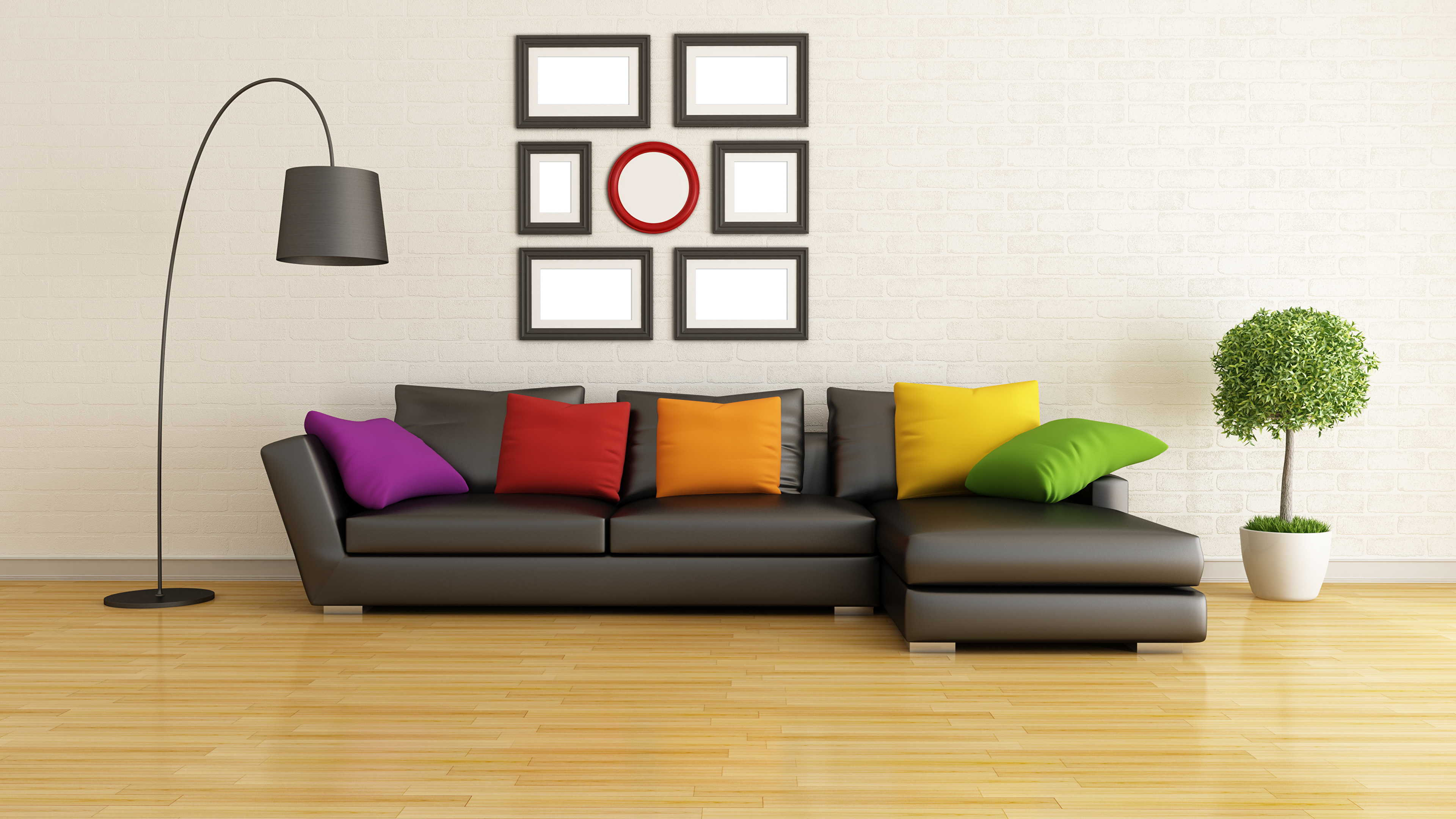 Description: A living room with a couch and a lamp on the floor and pictures on the wall above it and a potted plant.
