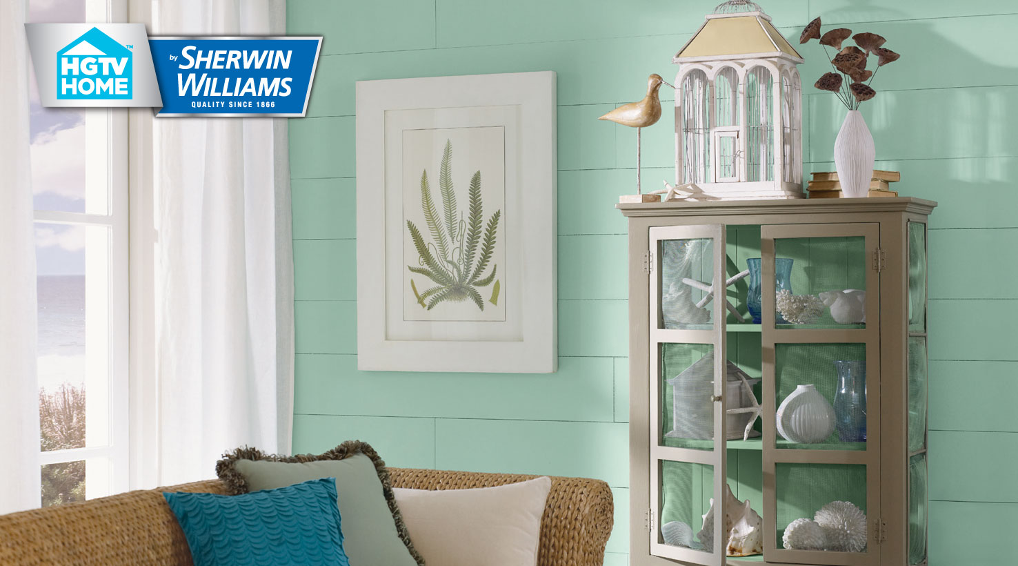 Description: A living room with a couch and a shelf with glass doors on it and a picture of a birdcage on the wall.