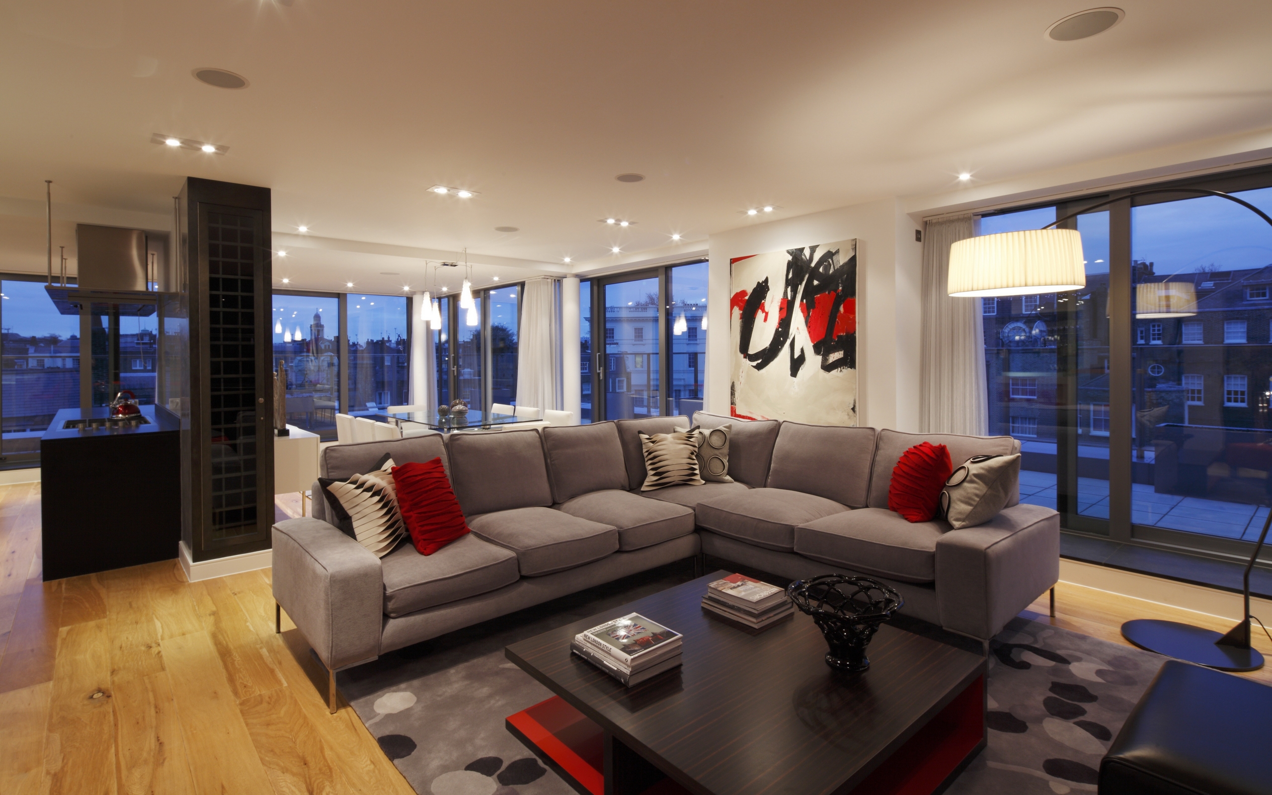 Description: A living room with a couch and a table in it with a large window overlooking the city outside of the room.