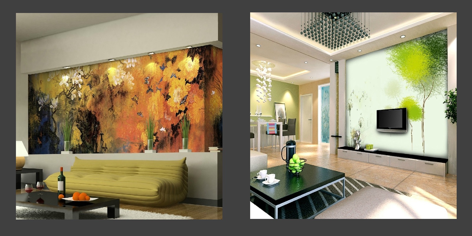Description: A living room with a couch a table and a tv on a wall and a painting on the wall.