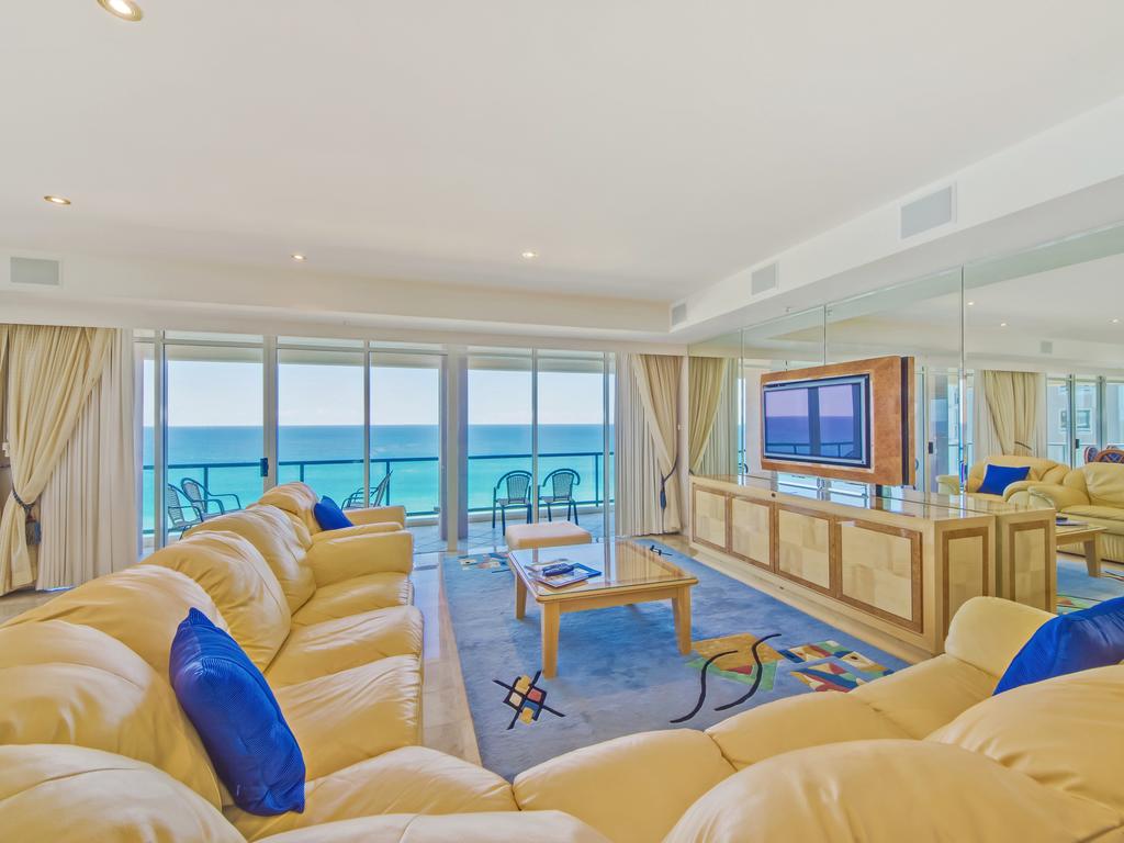 Description: A living room with a couch a table and a television on a stand in front of a window and a view of the ocean.