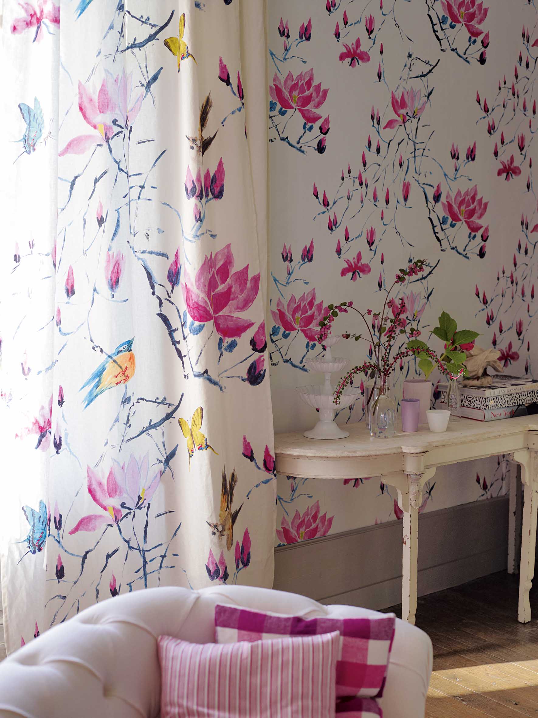 Description: A living room with a couch and a table with a vase on it and a flowered wallpaper.