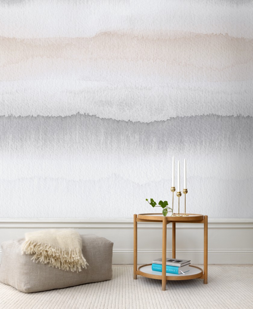 Description: A living room with a couch and a table with a vase on it and a wall painted with a watercolor.