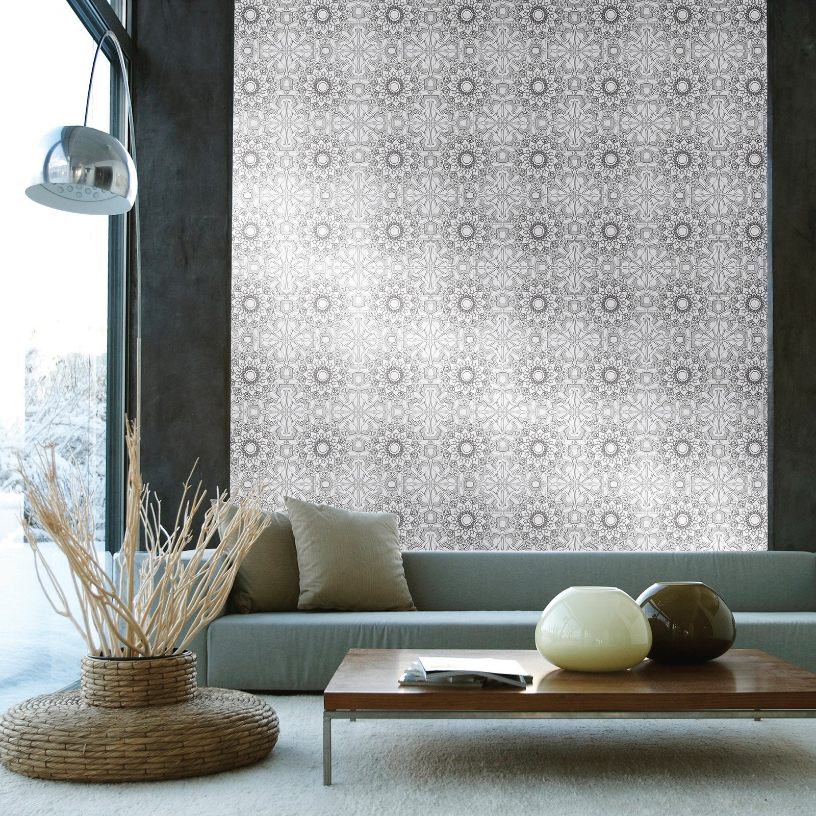 Description: A living room with a couch and a table in front of a large window with a large wall hanging.