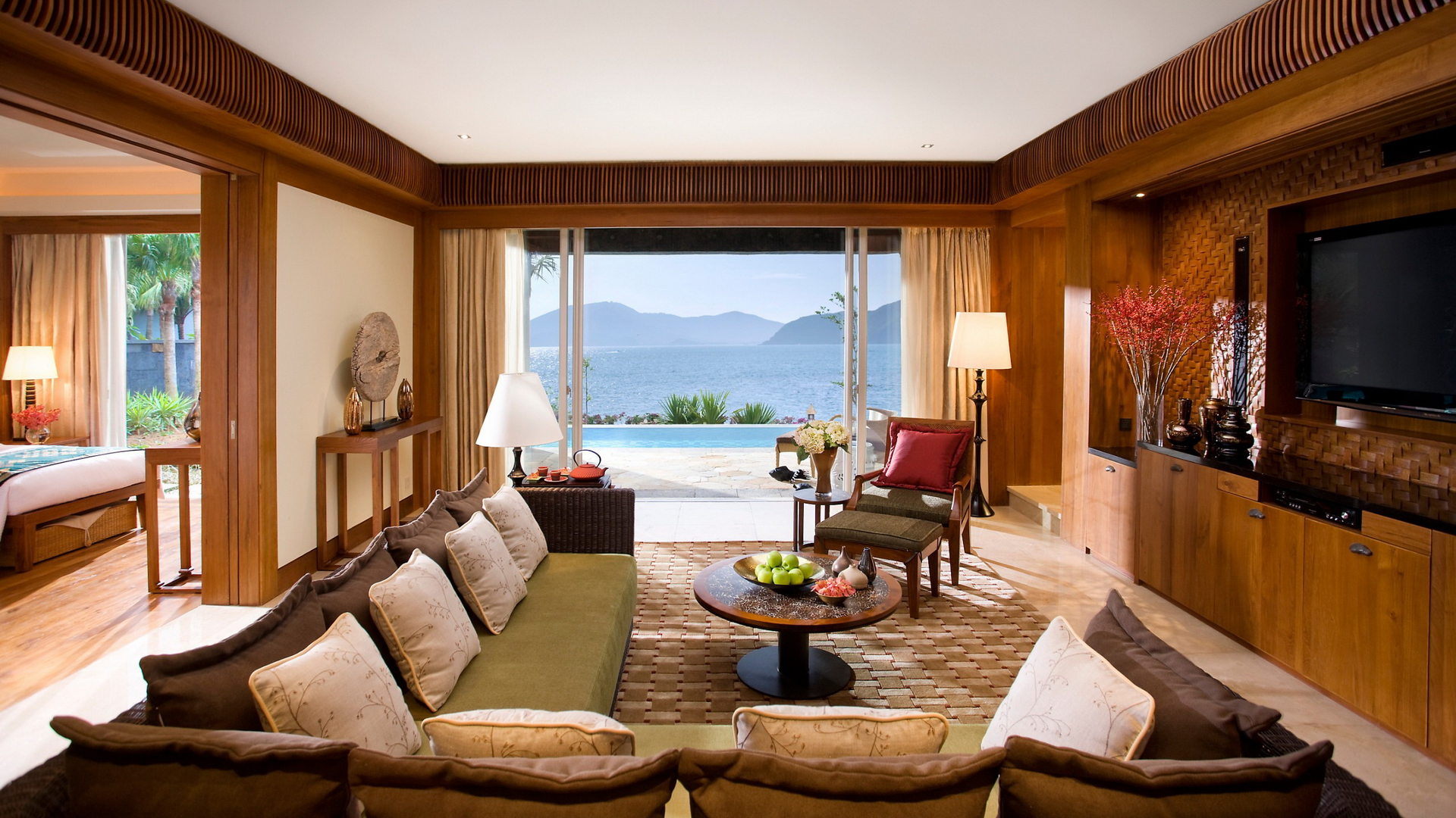 Description: A living room with a couch a table and a tv on a wall and a window with a view.