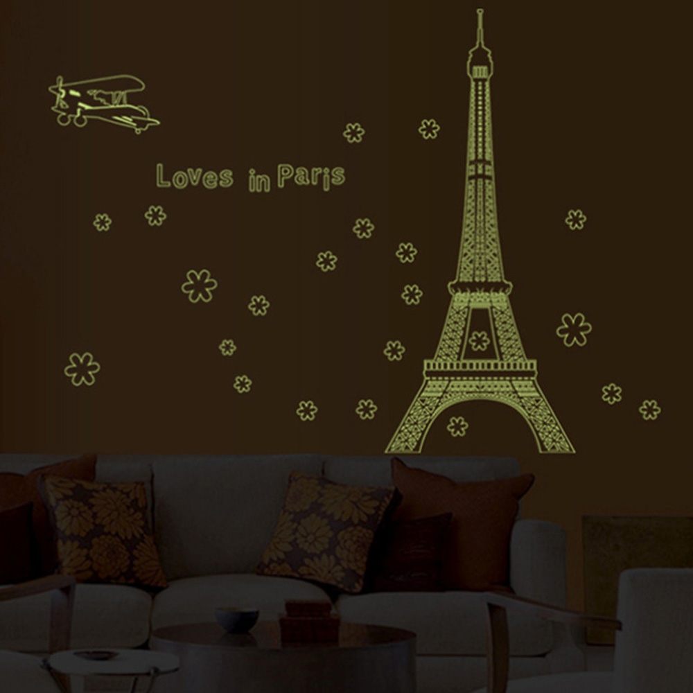Description: A living room with a wall sticker of the eiffel tower in paris.