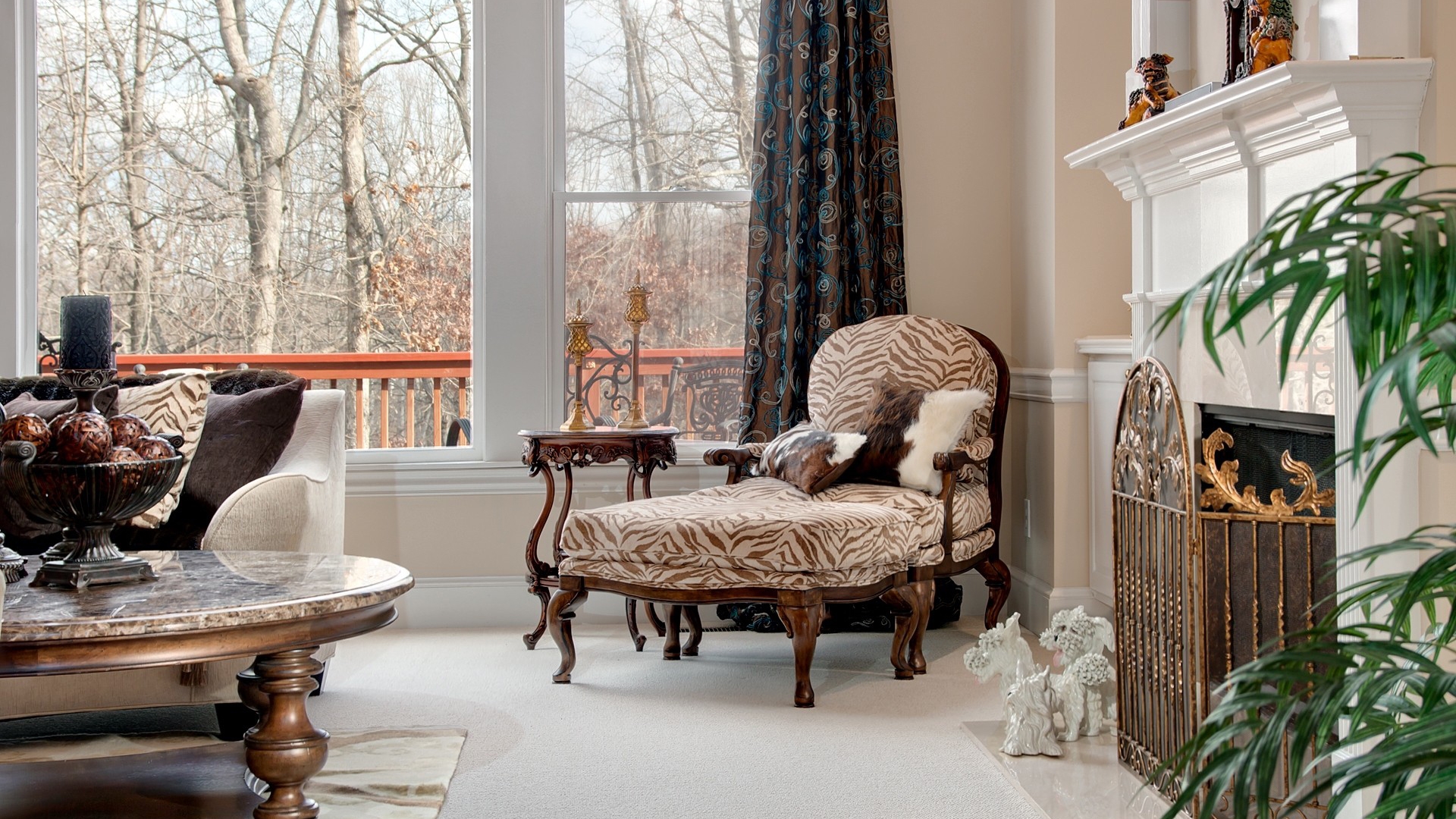 Description: A living room with a fireplace and a chair in it's corner with a large window overlooking the trees.