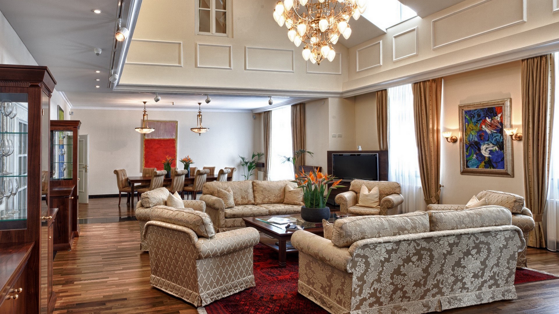 Description: A living room with a lot of furniture and a chandelier hanging from the ceiling and a painting on the wall.