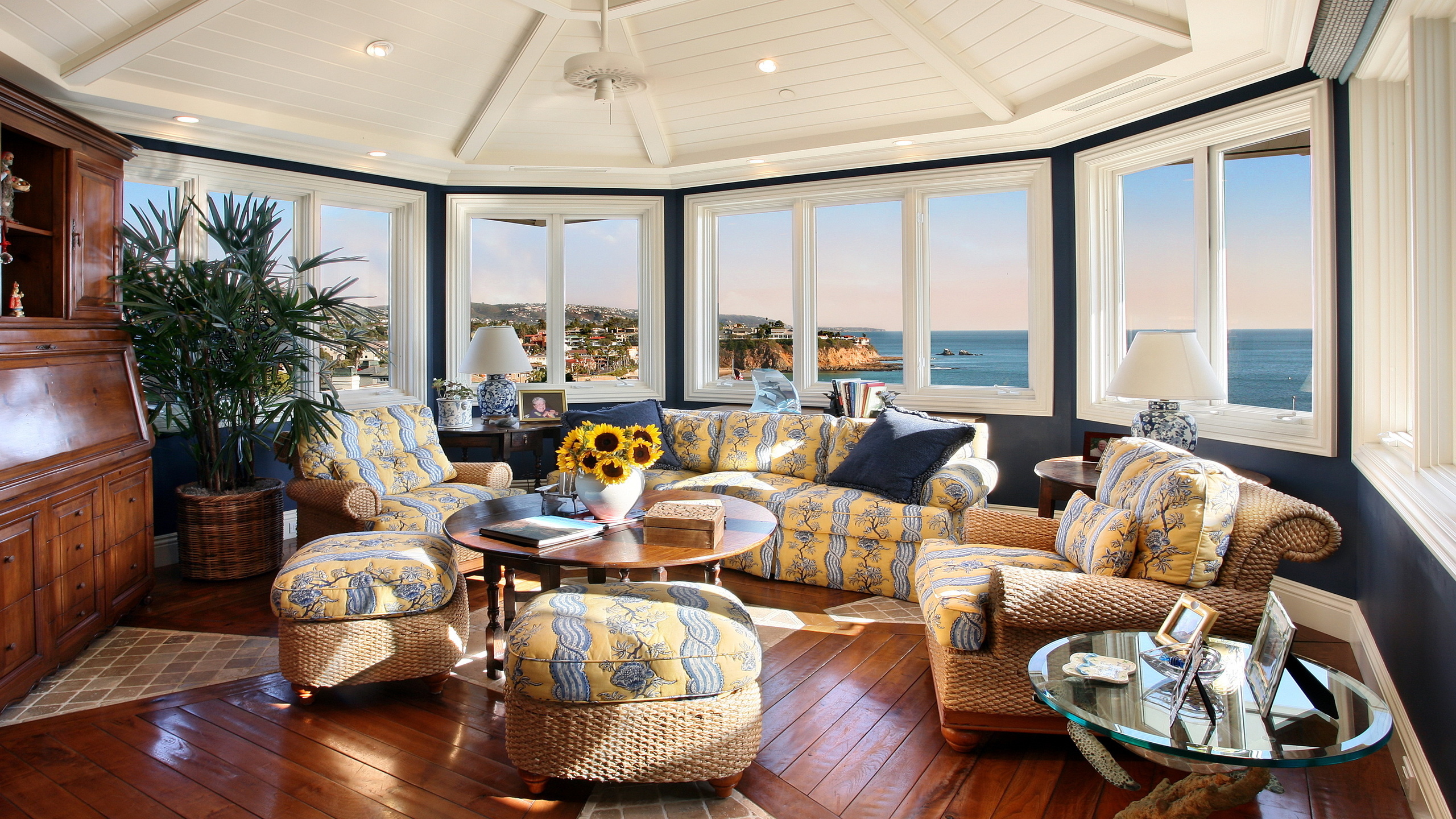 Description: A living room with a lot of furniture and a big window with a view of the ocean in it.