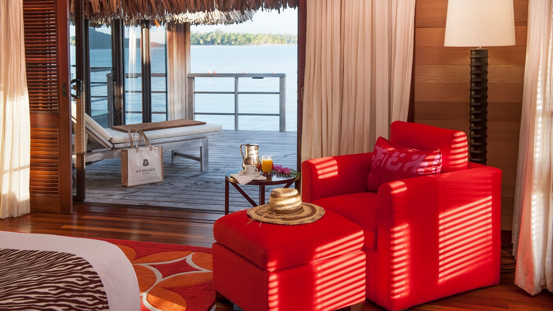 Description: A living room with a red couch and a chair and a table with a candle on it and a chair with a lamp on it.