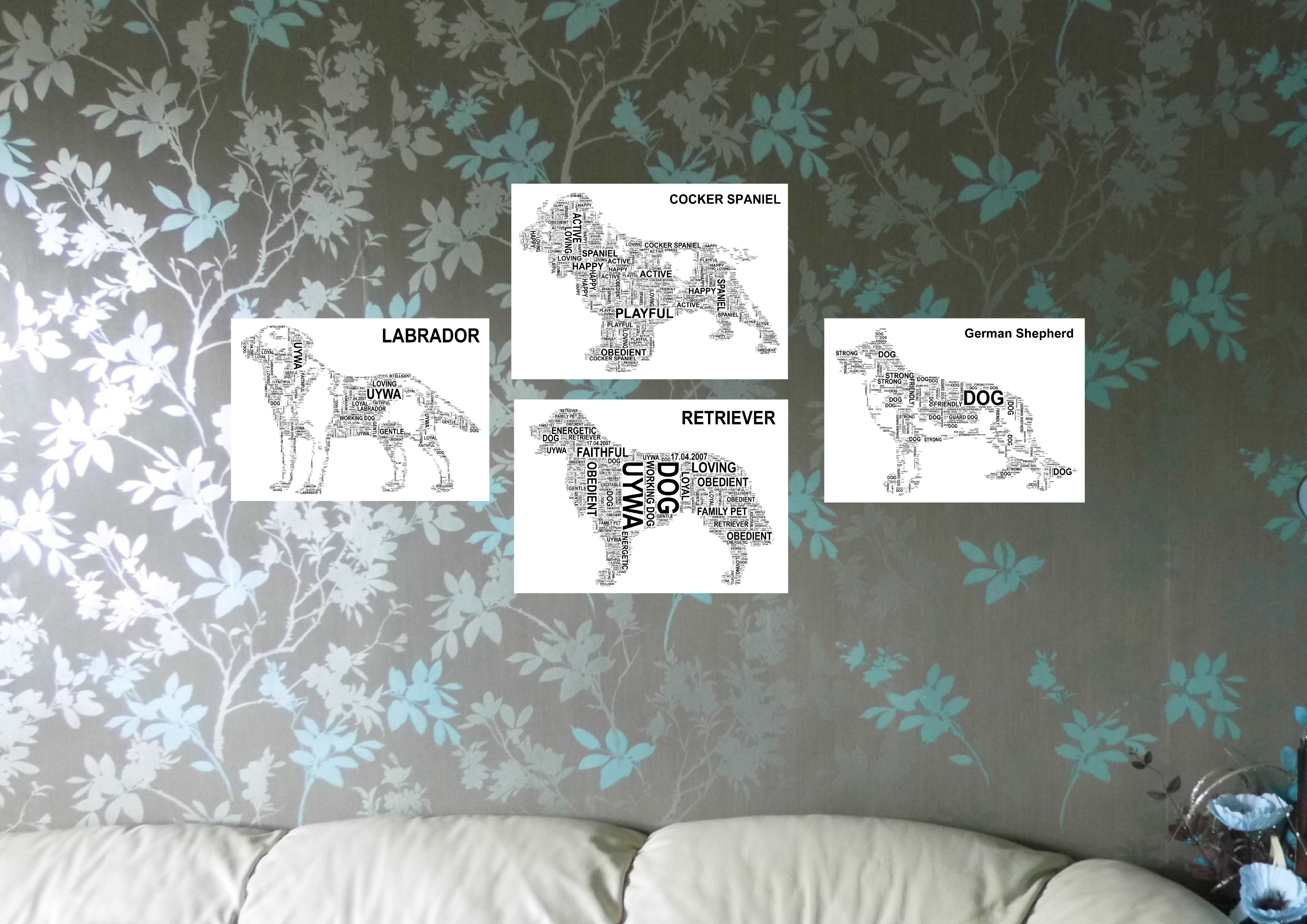 Description: A living room with a white couch and a wall with three pictures of dogs on it and a stuffed animal.
