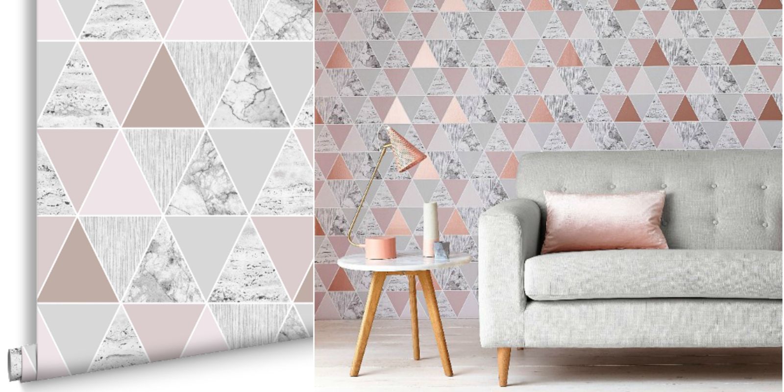 Description: A living room with a couch and a wallpaper design with triangles on it and a table with a lamp.