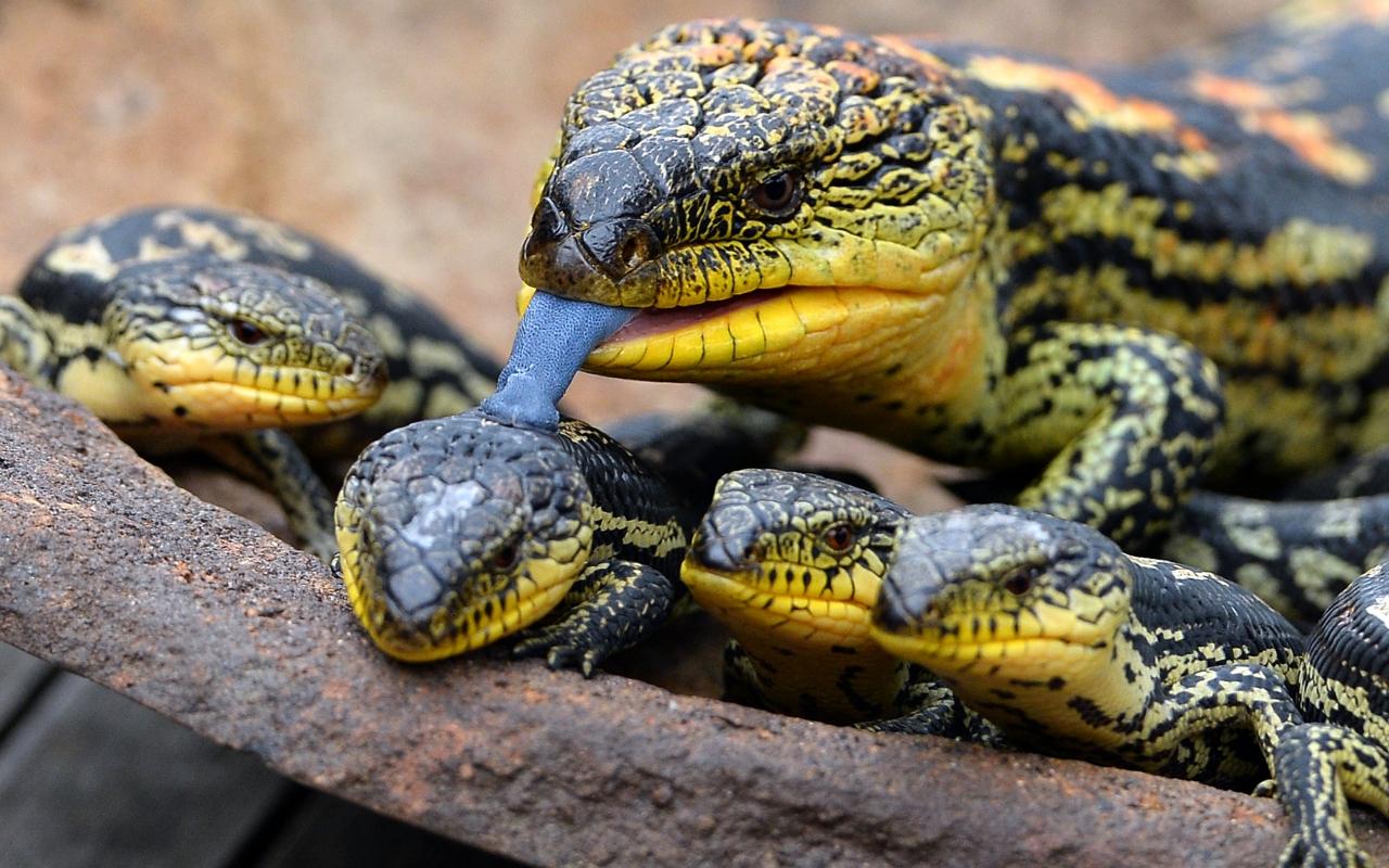 Description: A close up of a lizard eating something in its mouth with another lizard in the background behind it and a third lizard in the foreground.