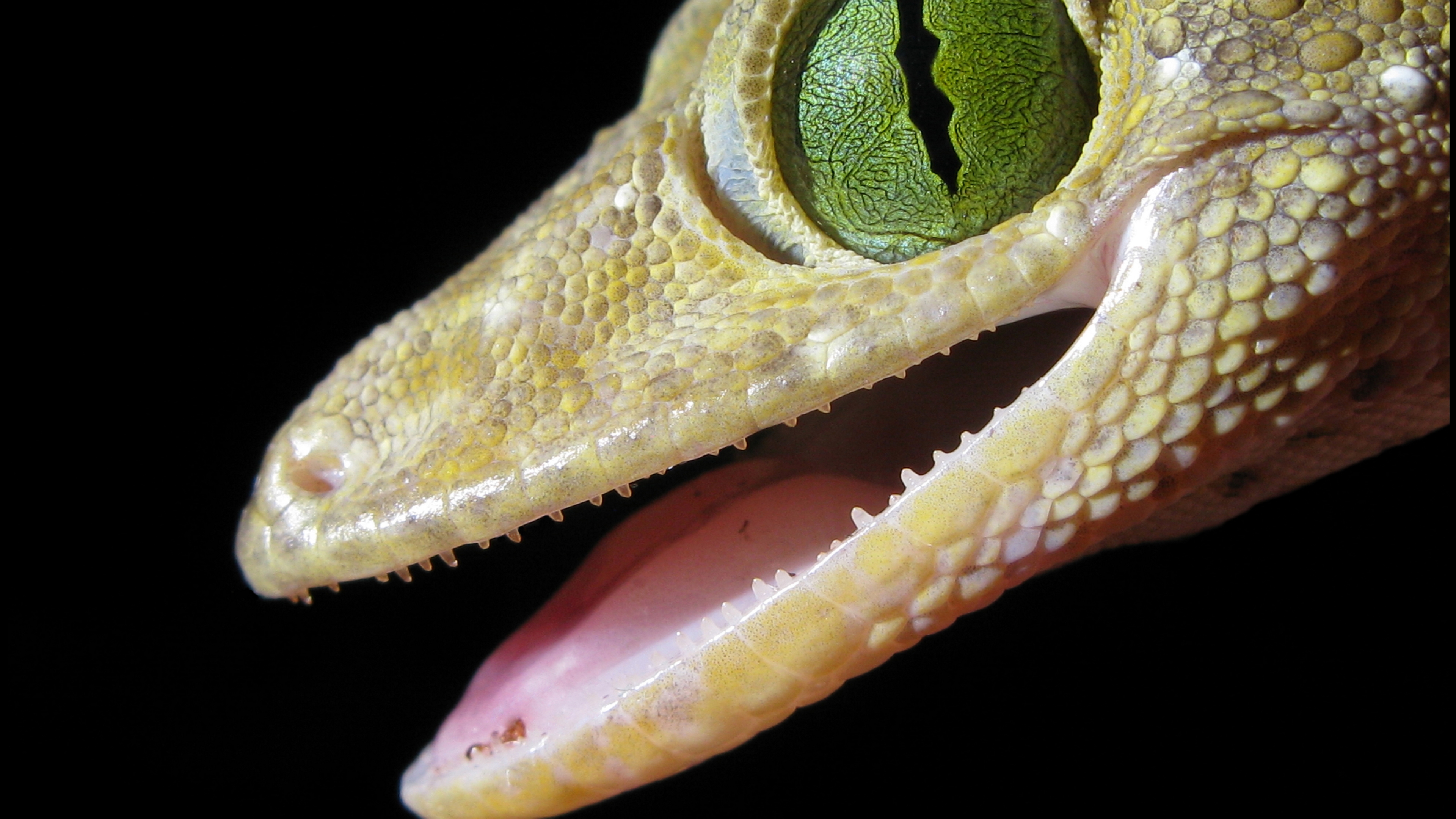 Description: A close up of a lizard's eye with a green leaf on it's head and a black background.