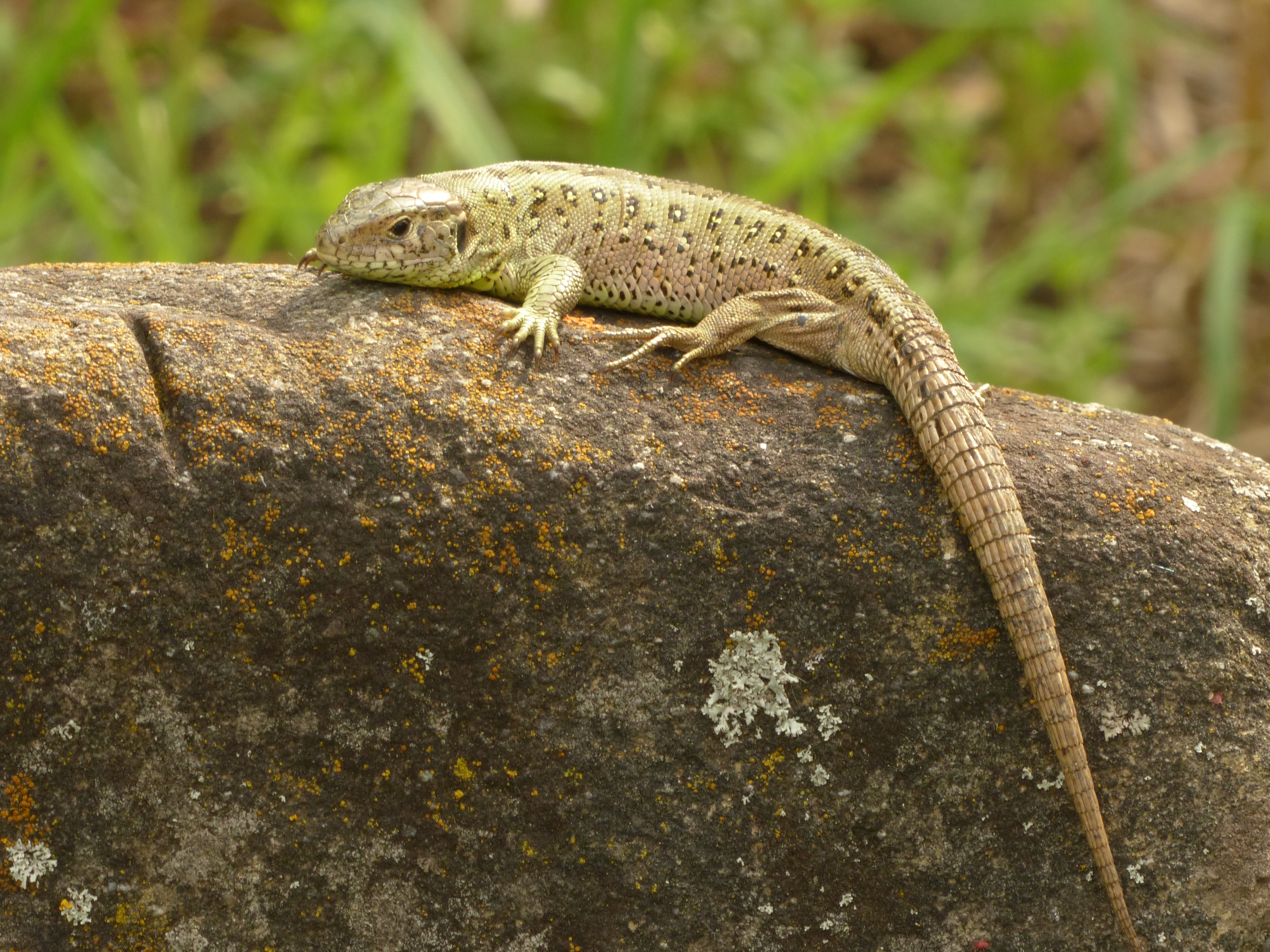 Description: A lizard is sitting on a rock in the wild.