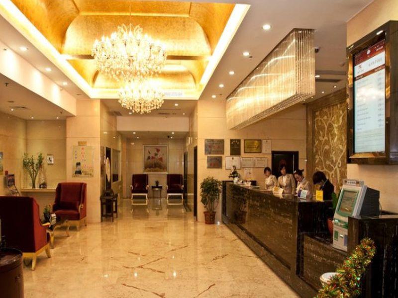 Description: A lobby with a chandelier and a bar in the middle of it with people sitting at the counter.
