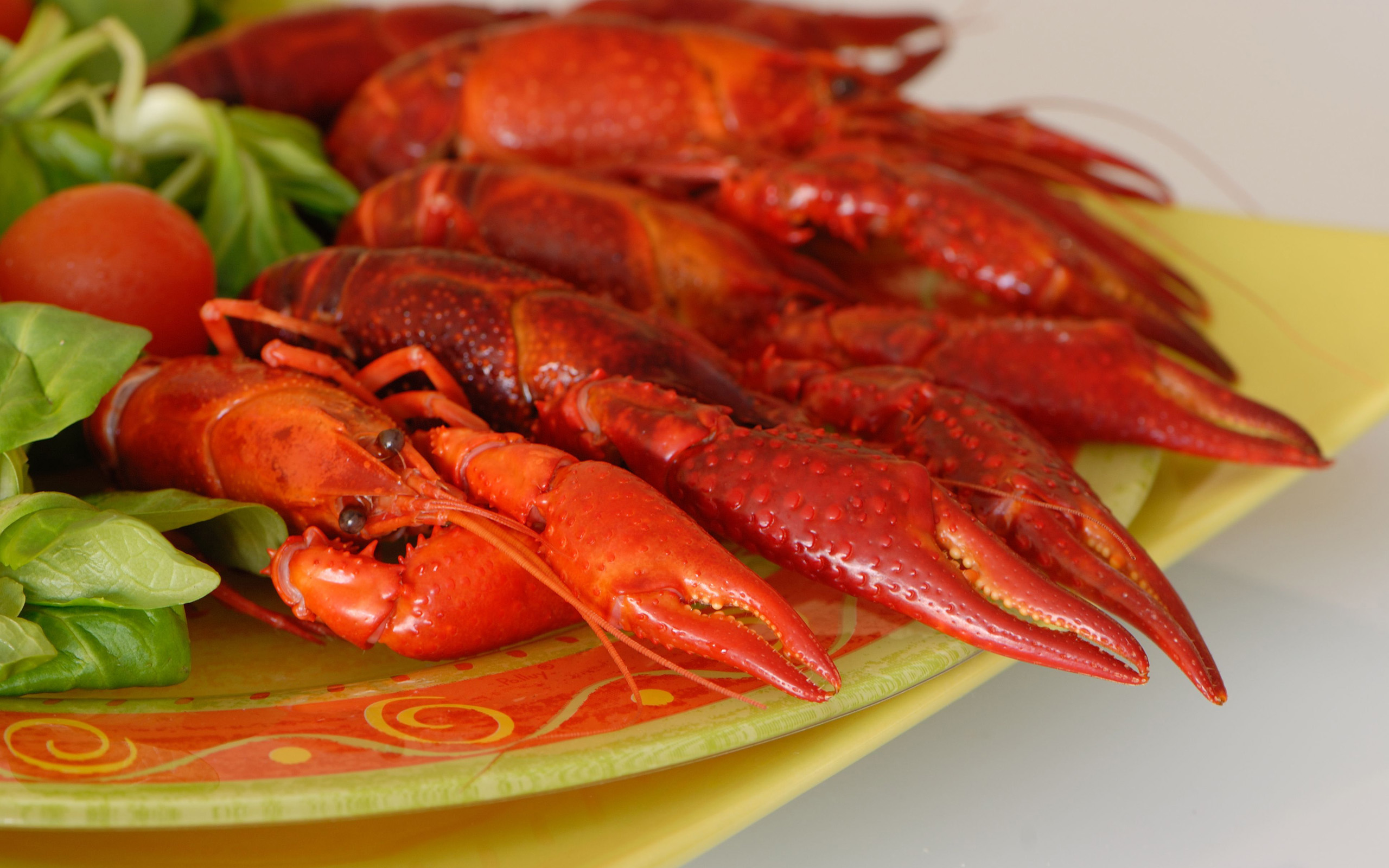 Description: A plate of lobsters and greens on a table with a yellow plate with a red border and a yellow plate with a red border.