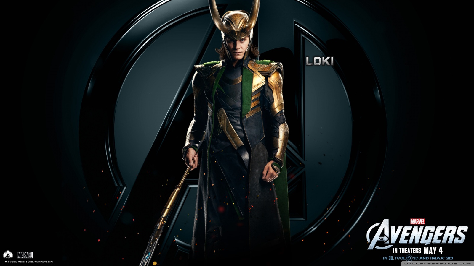 Description: The avengers movie character loki is standing in front of a black background with a golden helmet and a sword.