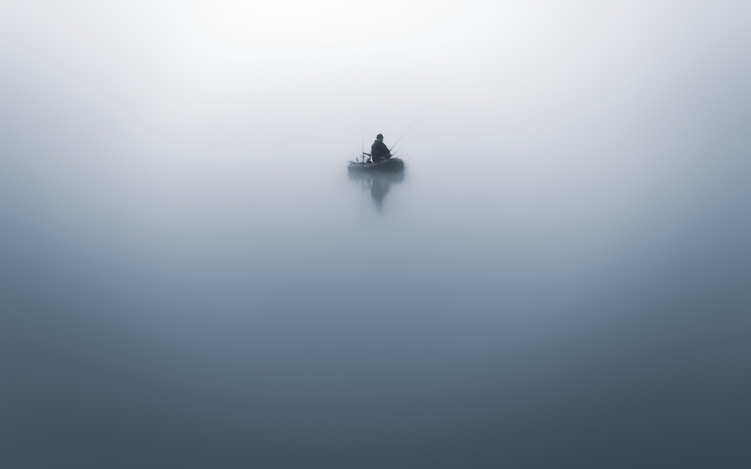 Description: A lone boat floating in the foggy water on a lake or lake with a person on it in the distance.