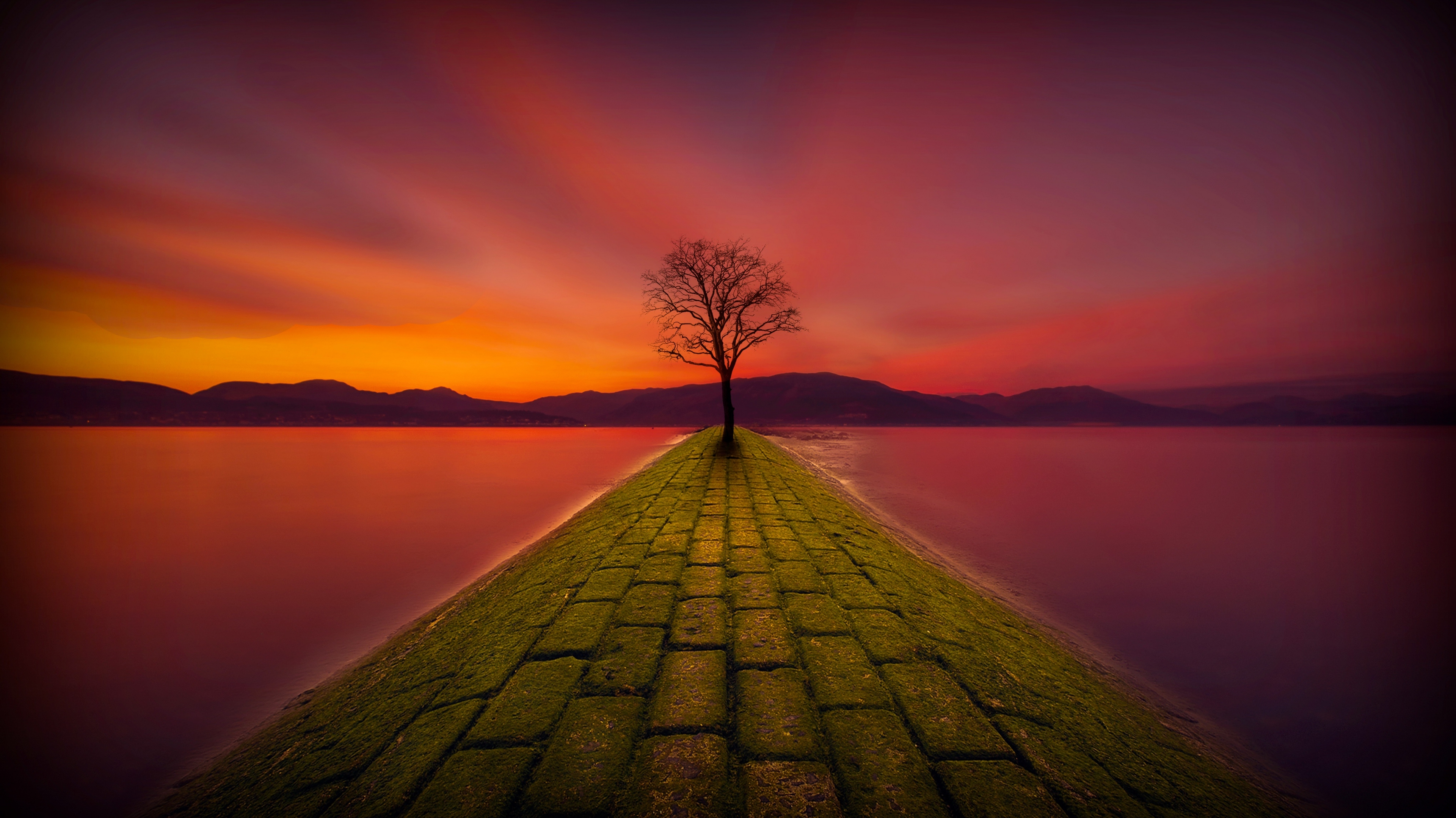 Description: A lone tree is standing on a long brick walkway near the water at sunset or dawn with a colorful sky.