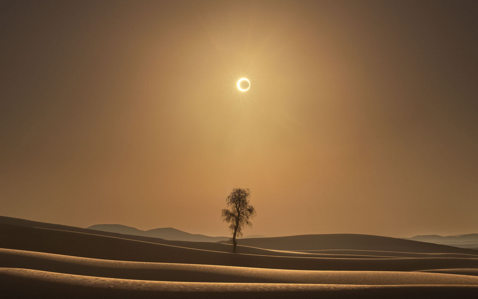 Description: A lone tree in the desert with the sun in the background and a partial eclipse in the sky above.