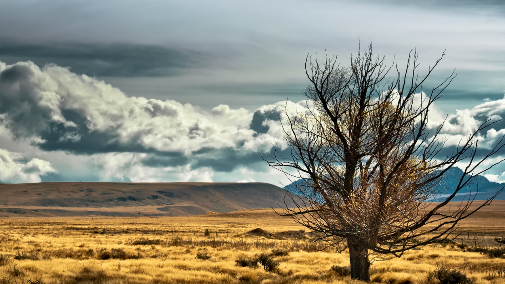 Description: A lone tree in a field with mountains in the background and clouds in the sky above it.