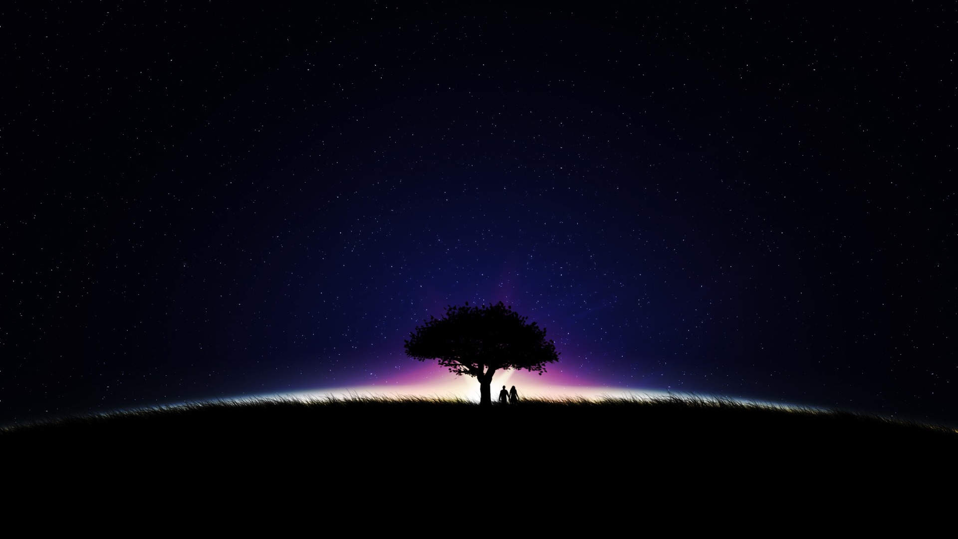 Description: A lone tree in a field at night with a purple sky and stars in the background with a purple and blue sky.