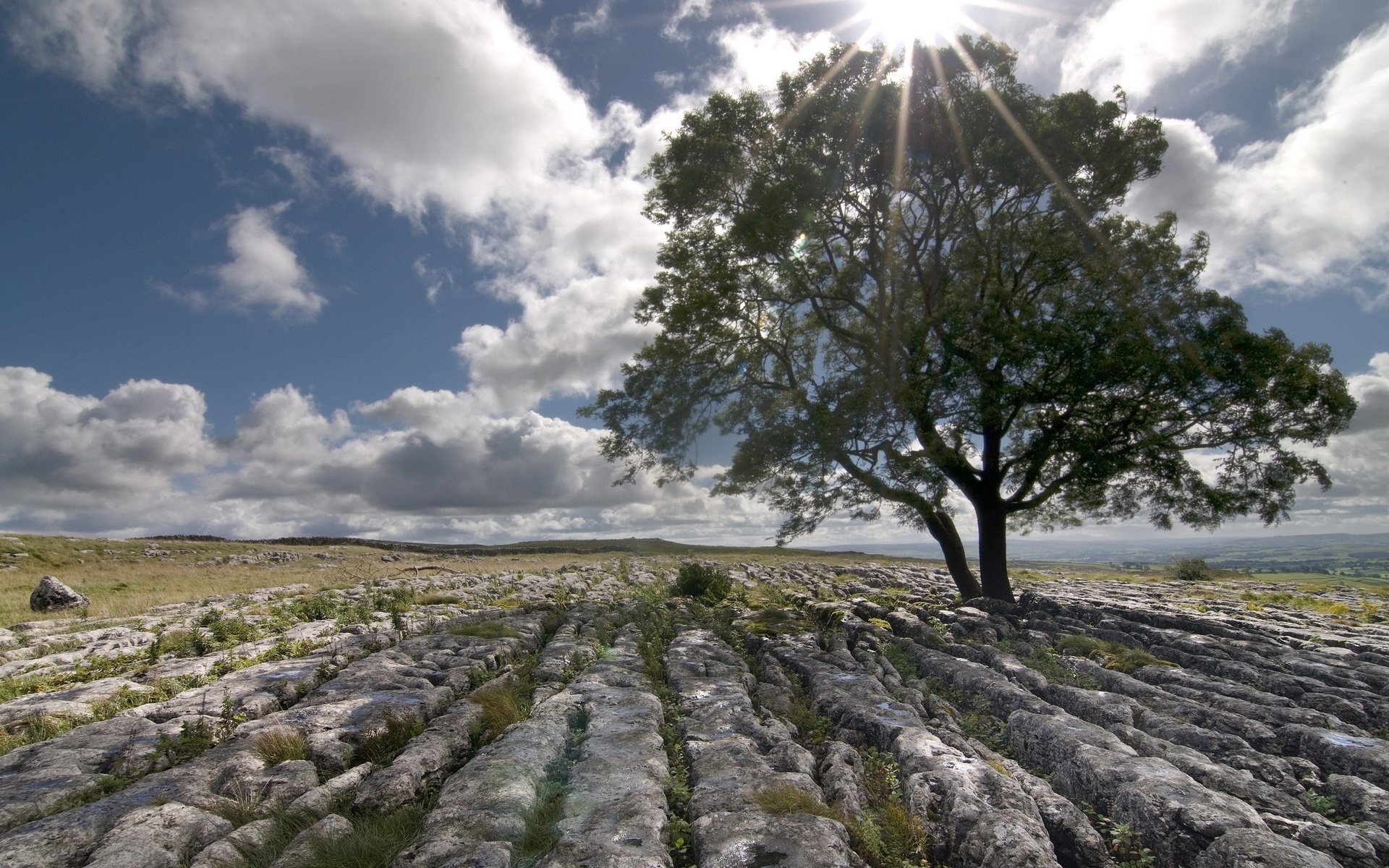 Description: A lone tree in a field with rocks and grass under a cloudy sky with sun shining through the clouds.