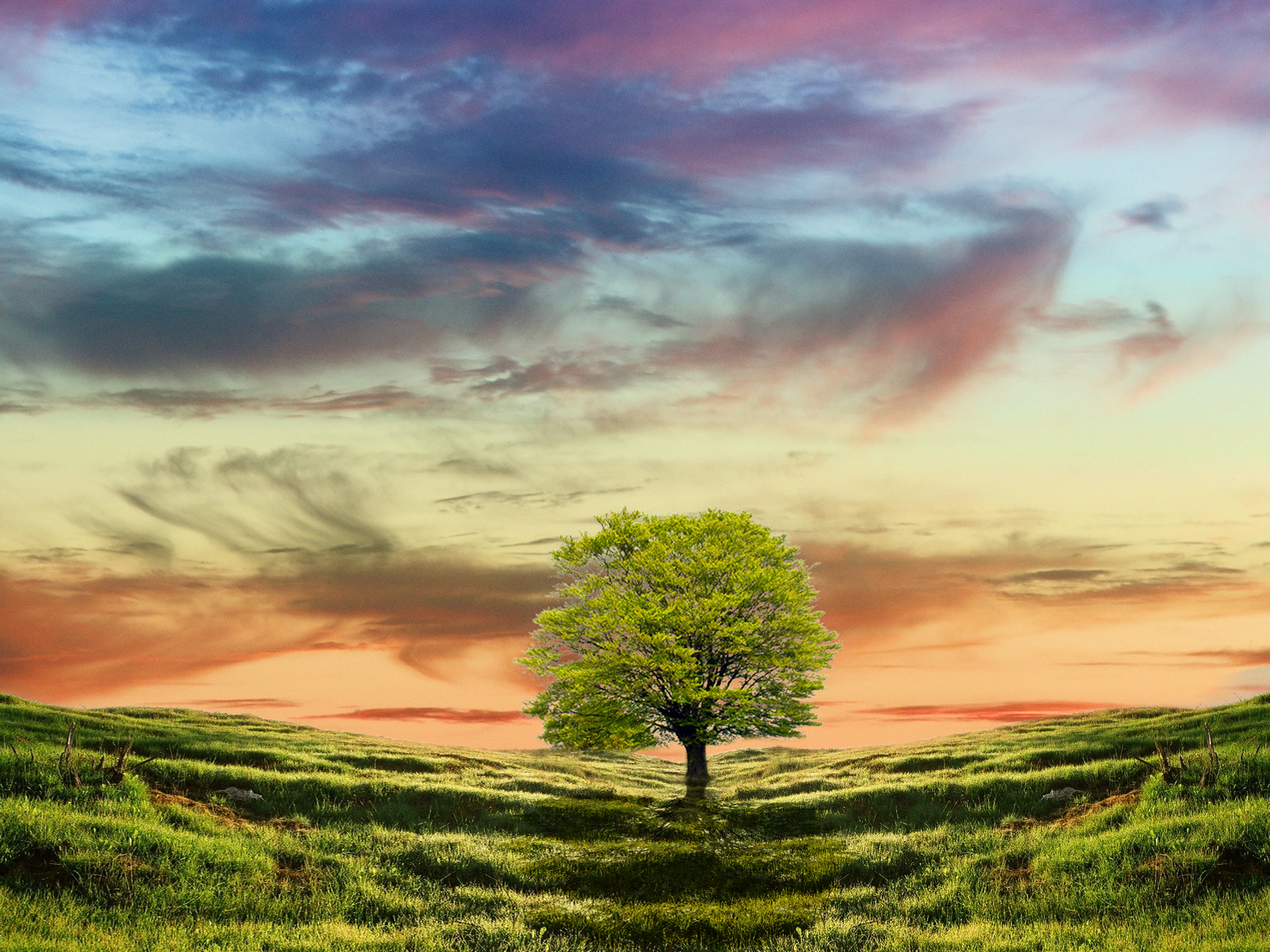 Description: A lone tree in a field with a sunset in the background and clouds in the sky above it.