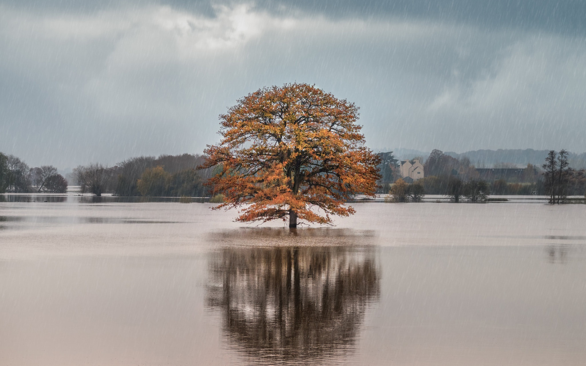 Description: A lone tree in a flooded area with a dark sky in the background and a few clouds in the sky.