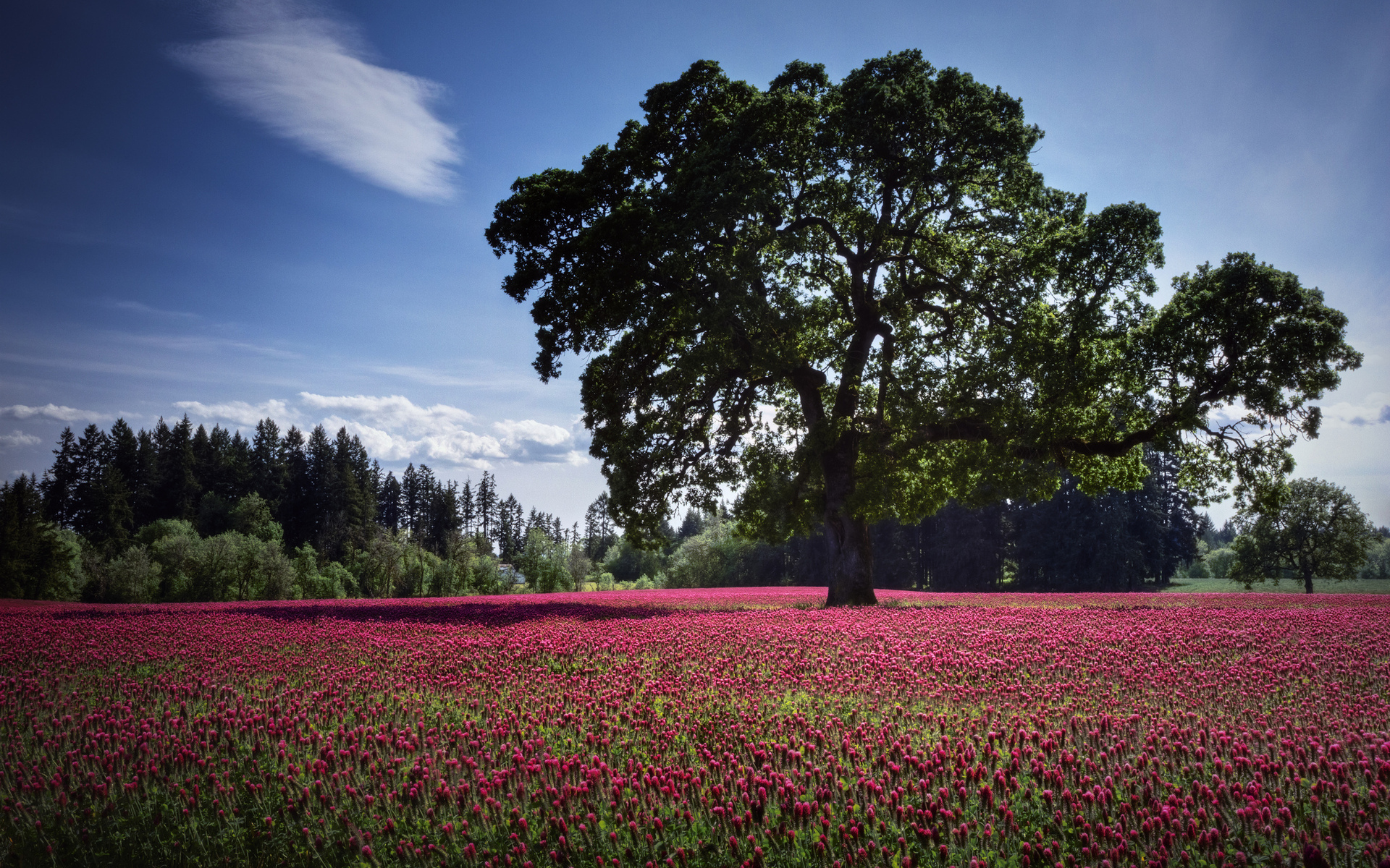 Description: A large tree in a field of flowers under a blue sky with clouds above it and a lone tree in the middle.