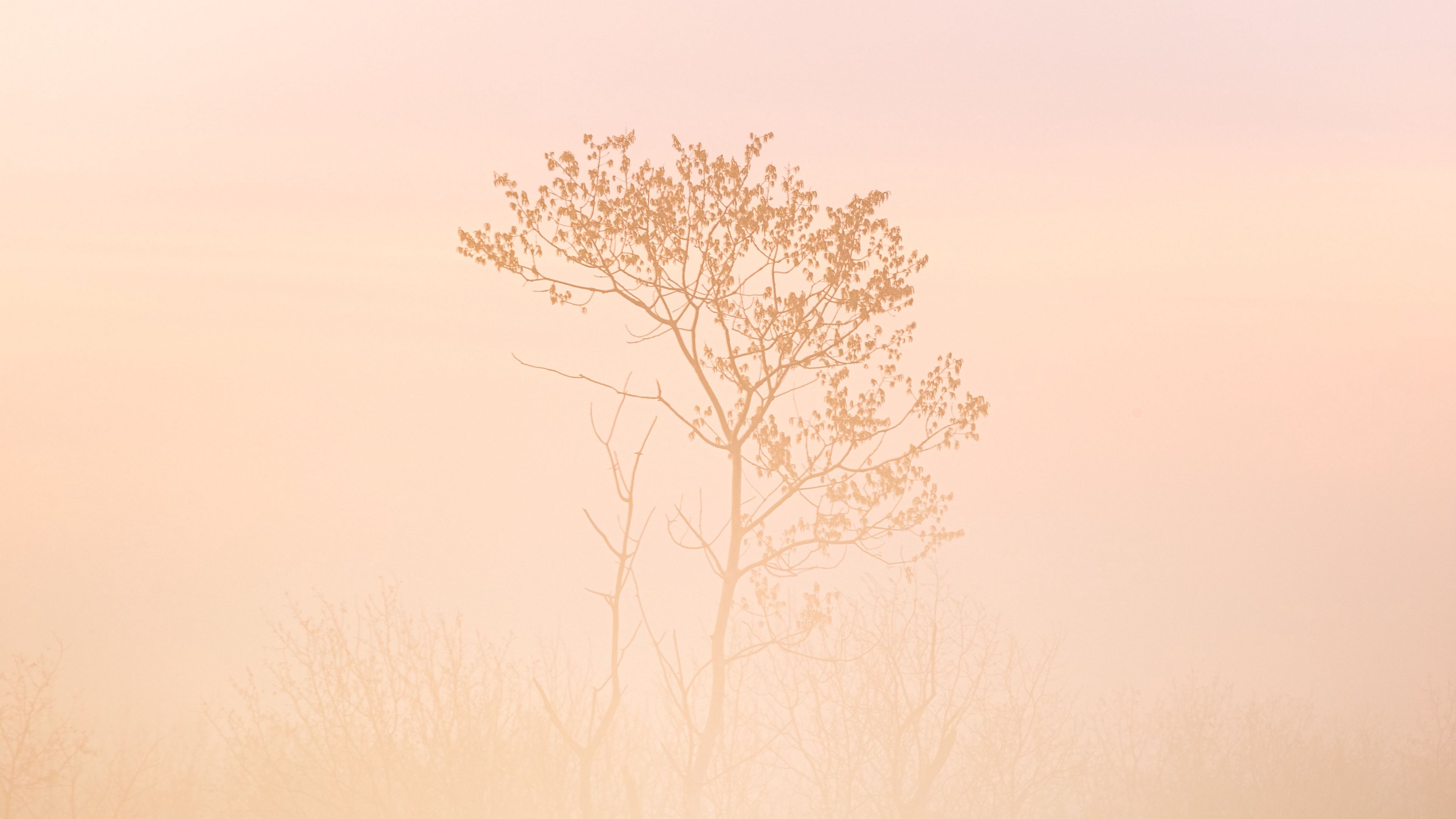 Description: A lone tree in a foggy field with a light colored sky behind it and a few trees in the foreground.