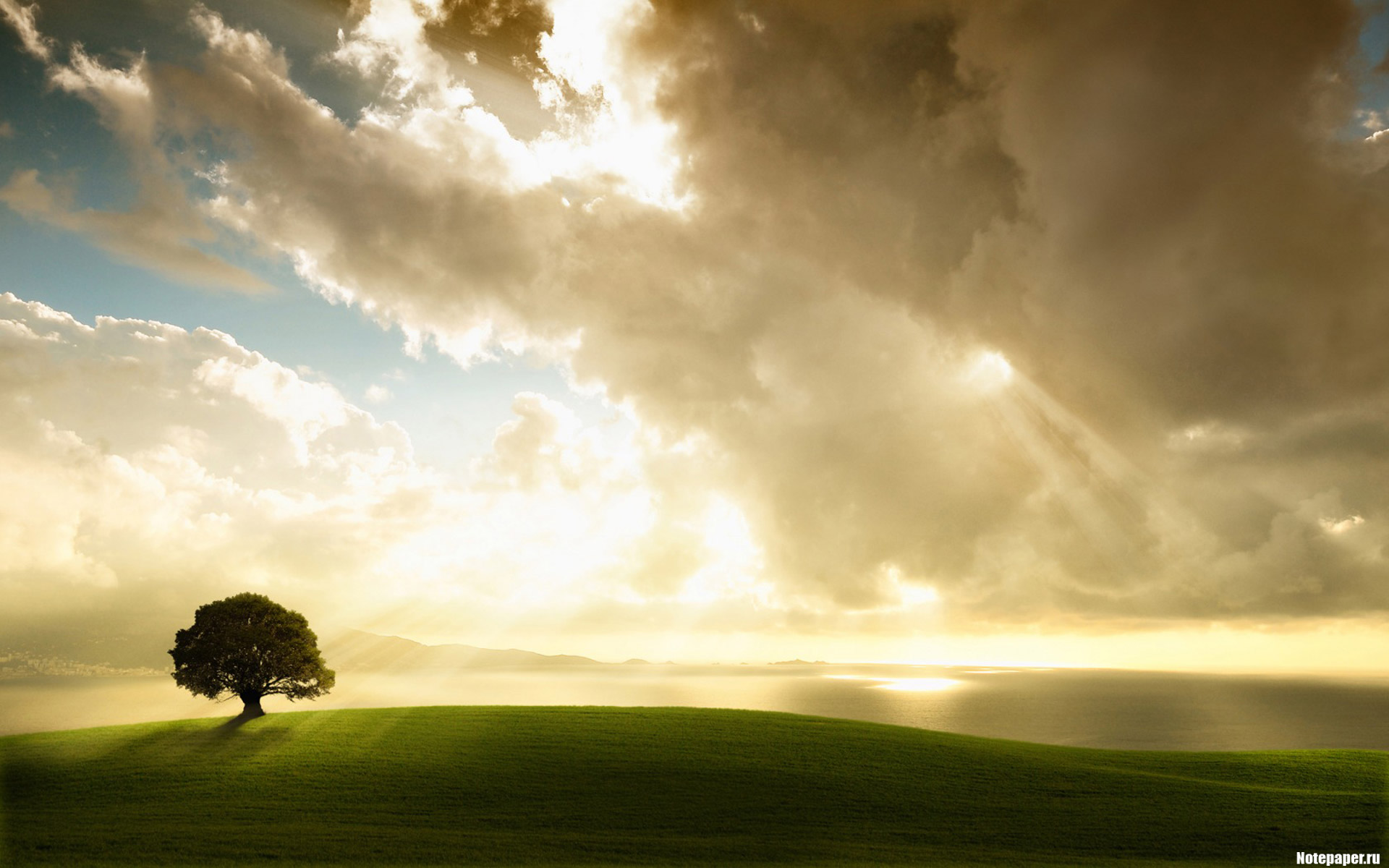 Description: A lone tree on a grassy hill under a cloudy sky with sun rays coming through the clouds and a body of water in the distance.