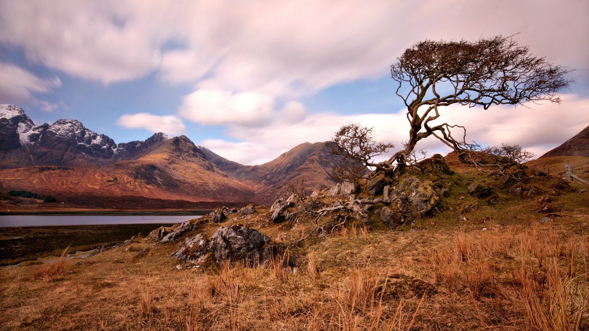 Description: A lone tree on a grassy hill with mountains in the background and a lake in the foreground with a few clouds in the sky.