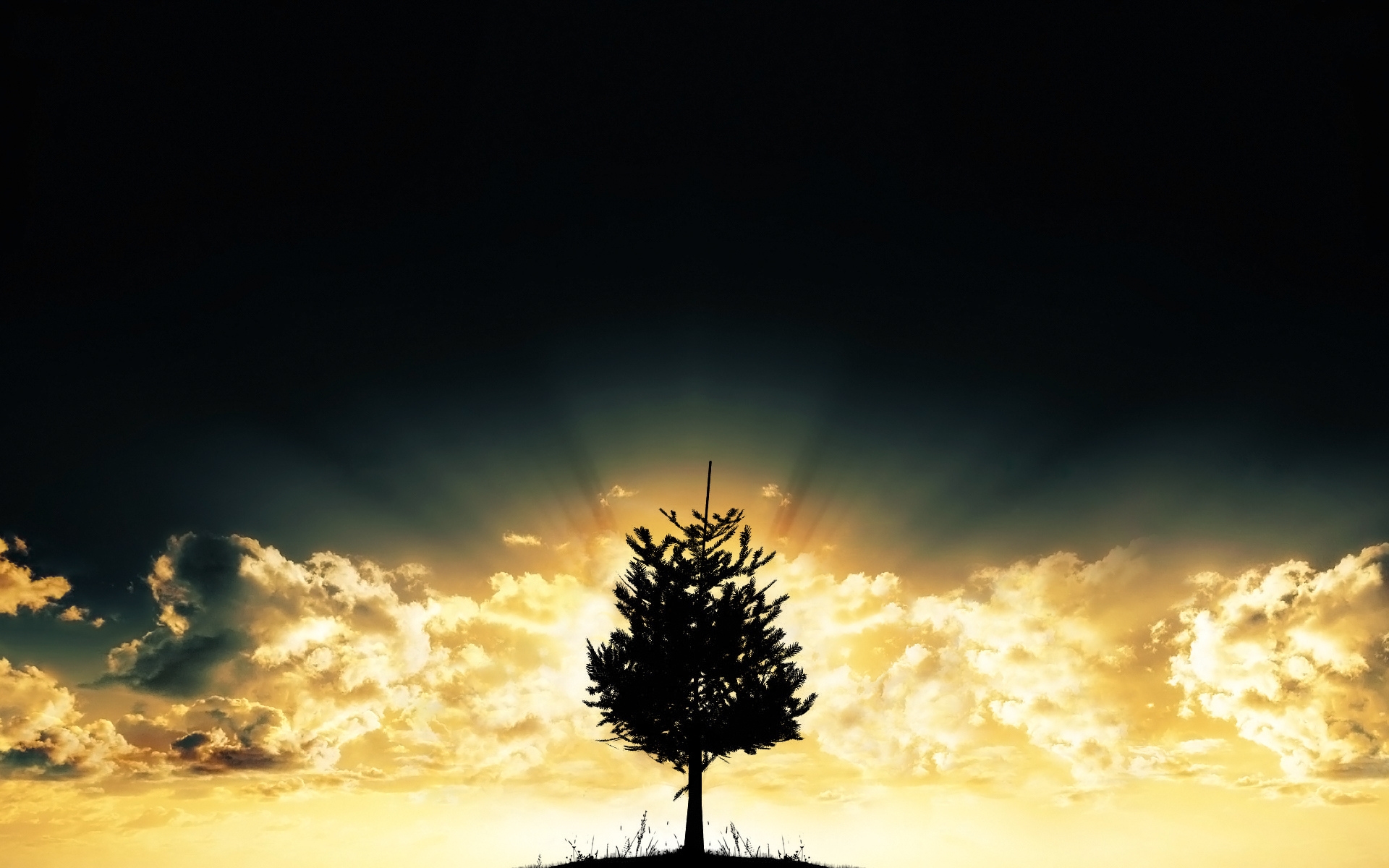 Description: A lone tree on a hill with a sunset in the background with clouds in the sky and sunbeams in the sky.