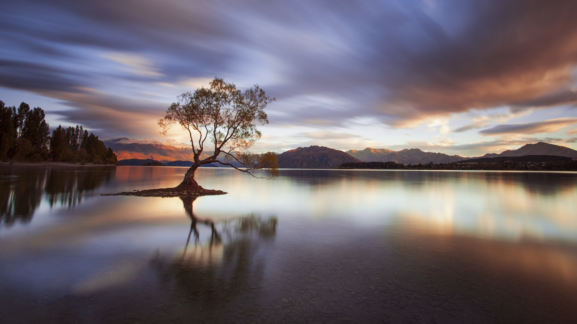 Description: A lone tree is standing in the middle of a lake at sunset with mountains in the background and clouds in the sky.