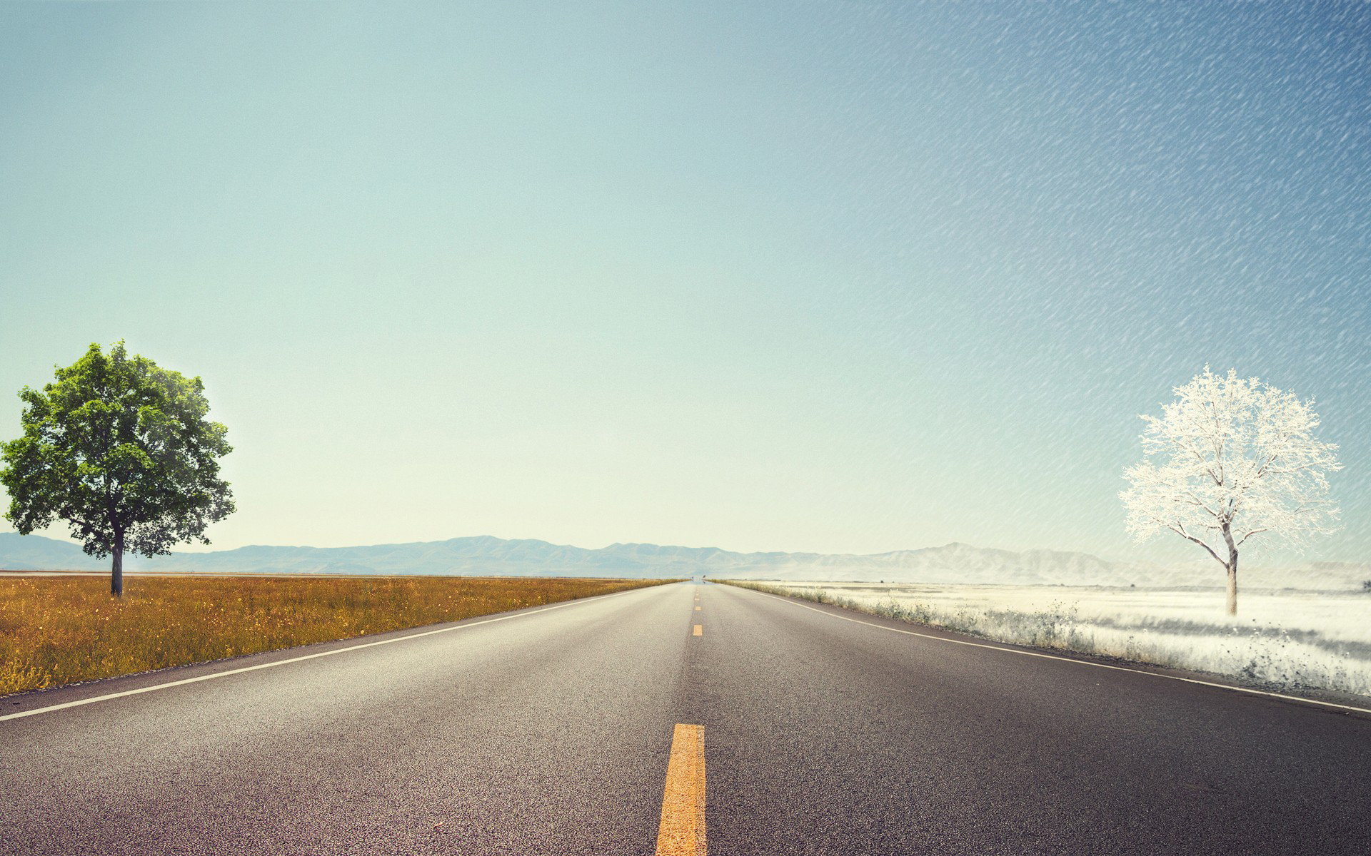 Description: A tree is standing on the side of a road in the middle of nowhere.
