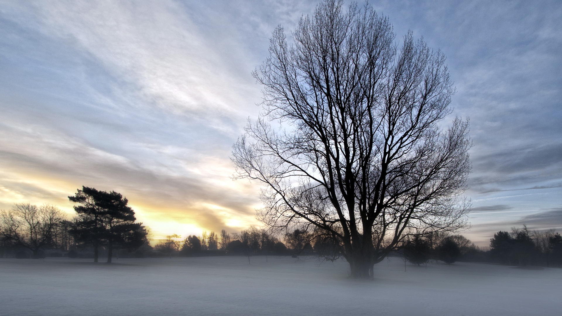 Description: A lone tree in a snowy field with a sunset in the background and clouds in the sky above it.