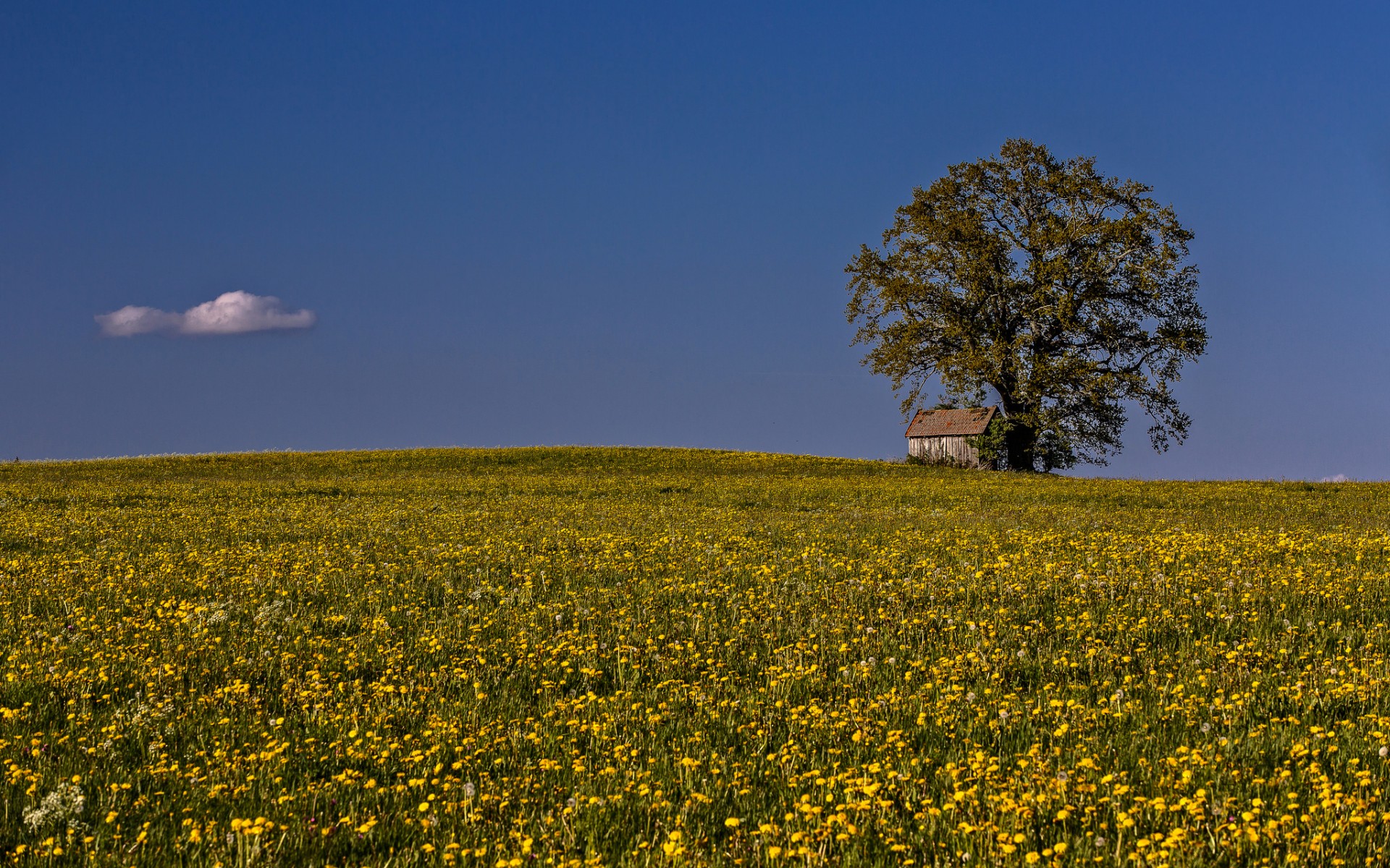 Description: A lone tree stands in a field of yellow flowers and a lone house sits in the distance on a clear day.