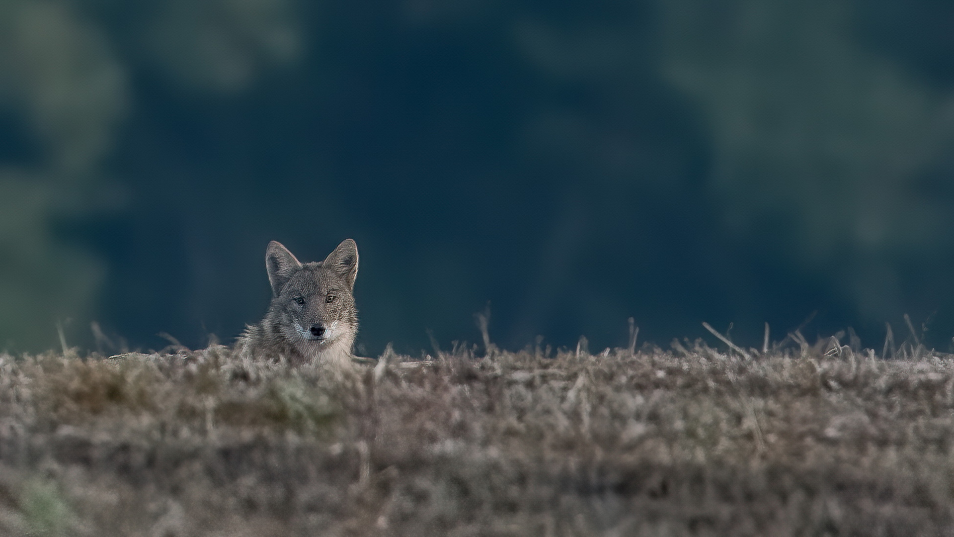 Description: A lone wolf is sitting in a field of grass and weeds.