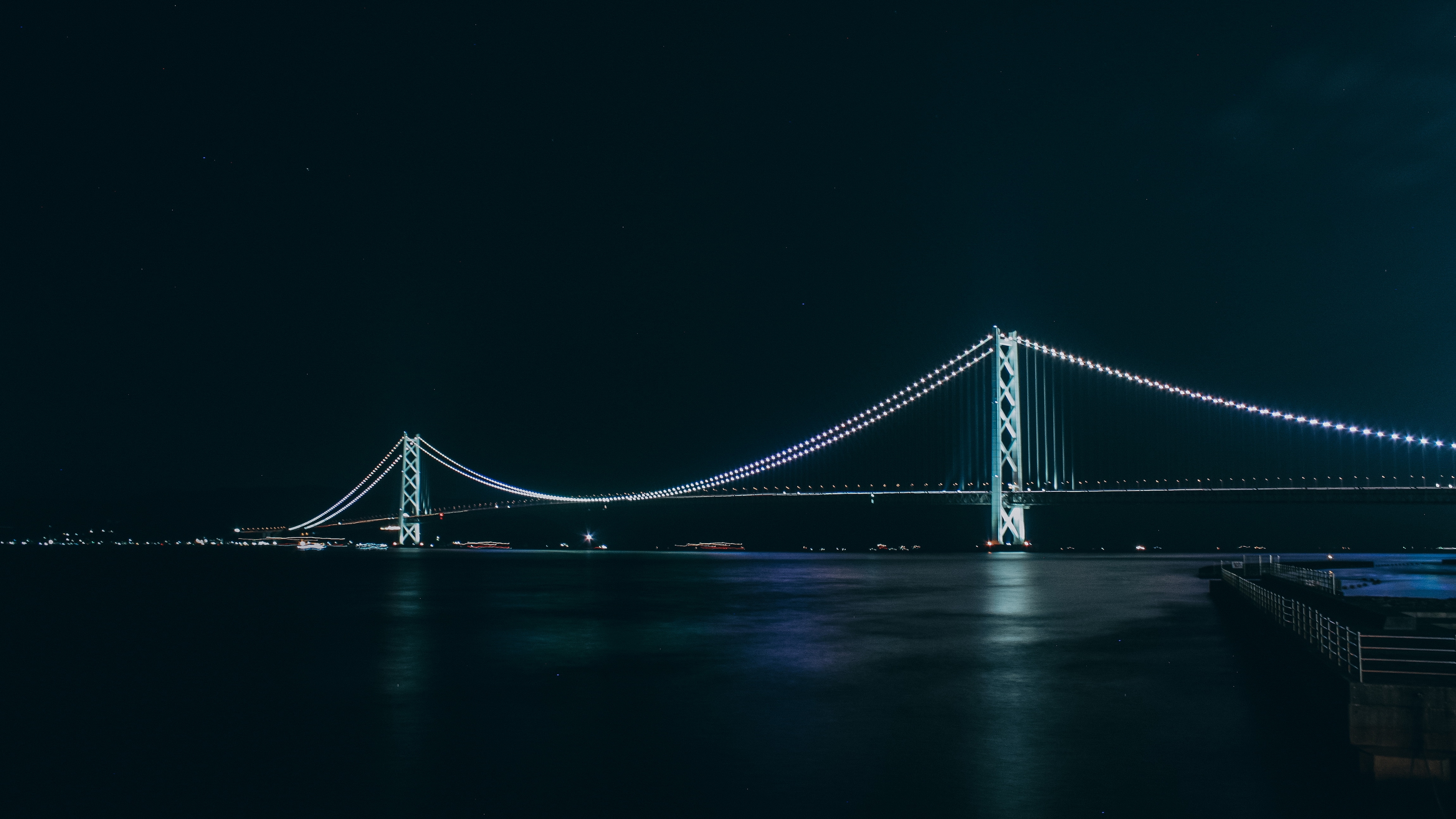 Description: A long bridge is lit up at night over the water with a clock tower in the distance and a full moon in the sky.