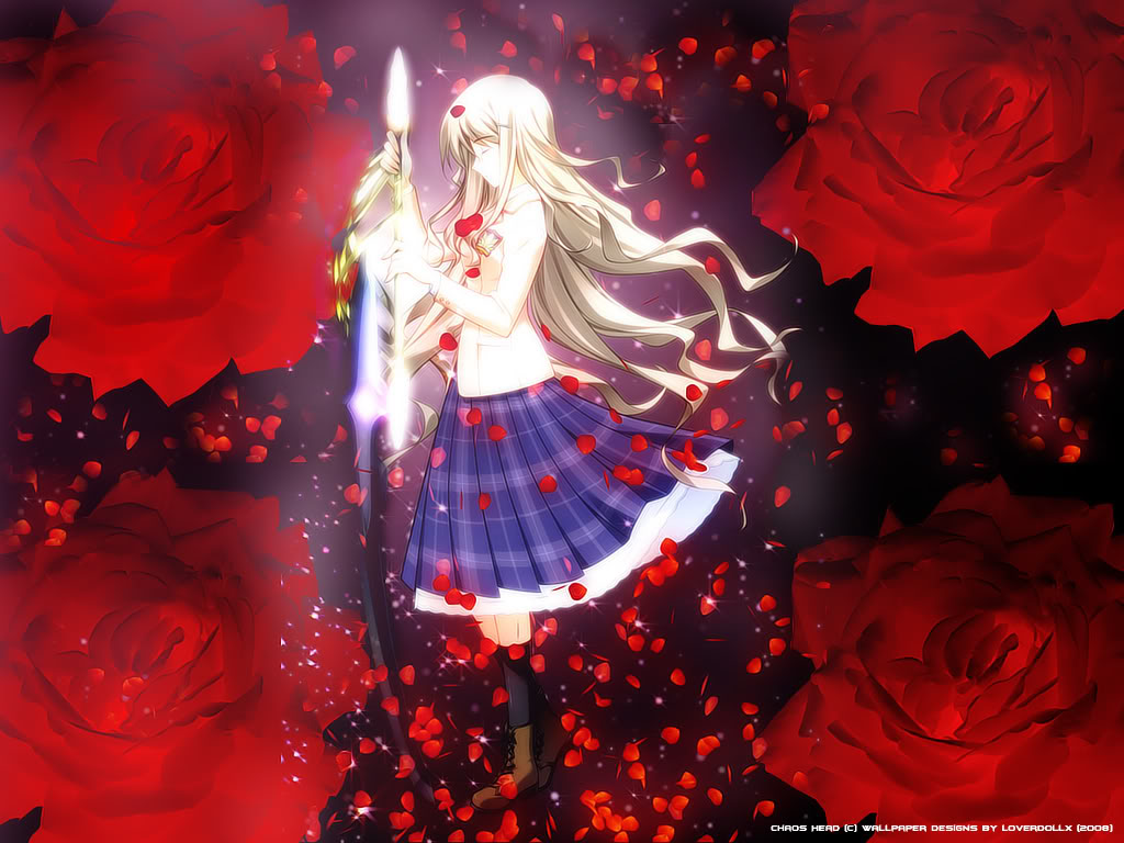 Description: A girl with long hair holding a sword in front of roses and petals in a dark room with red roses.