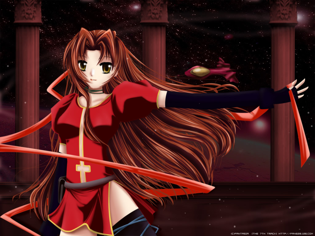 Description: A woman with long hair holding a bow and arrow in her hand and a red dress with a cross on it.
