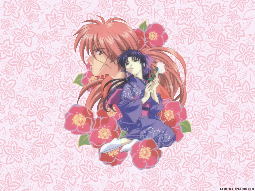Description: A girl with long hair and a flower in her hair sitting on a pink background with pink flowers and leaves.