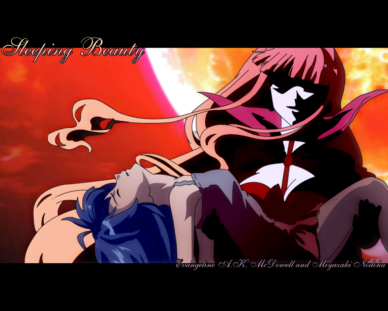 Description: A woman with long hair and a black dress sitting next to another woman with long hair and a red and orange background.