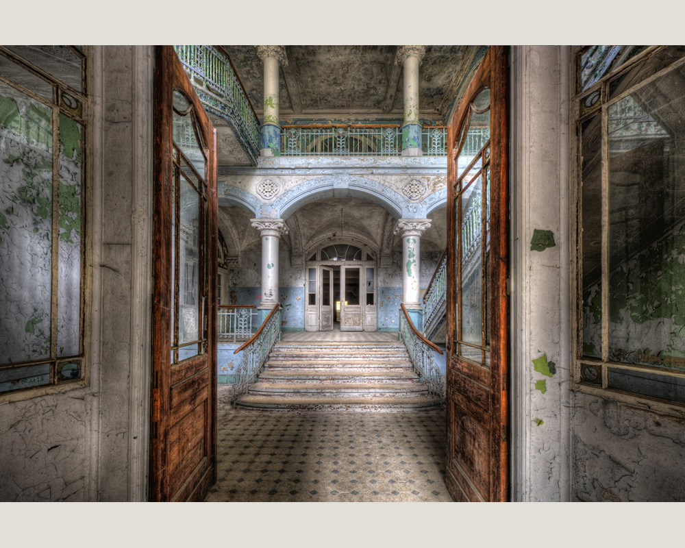 Description: A long hallway with a tiled floor and a set of doors leading to another room with a tiled floor.