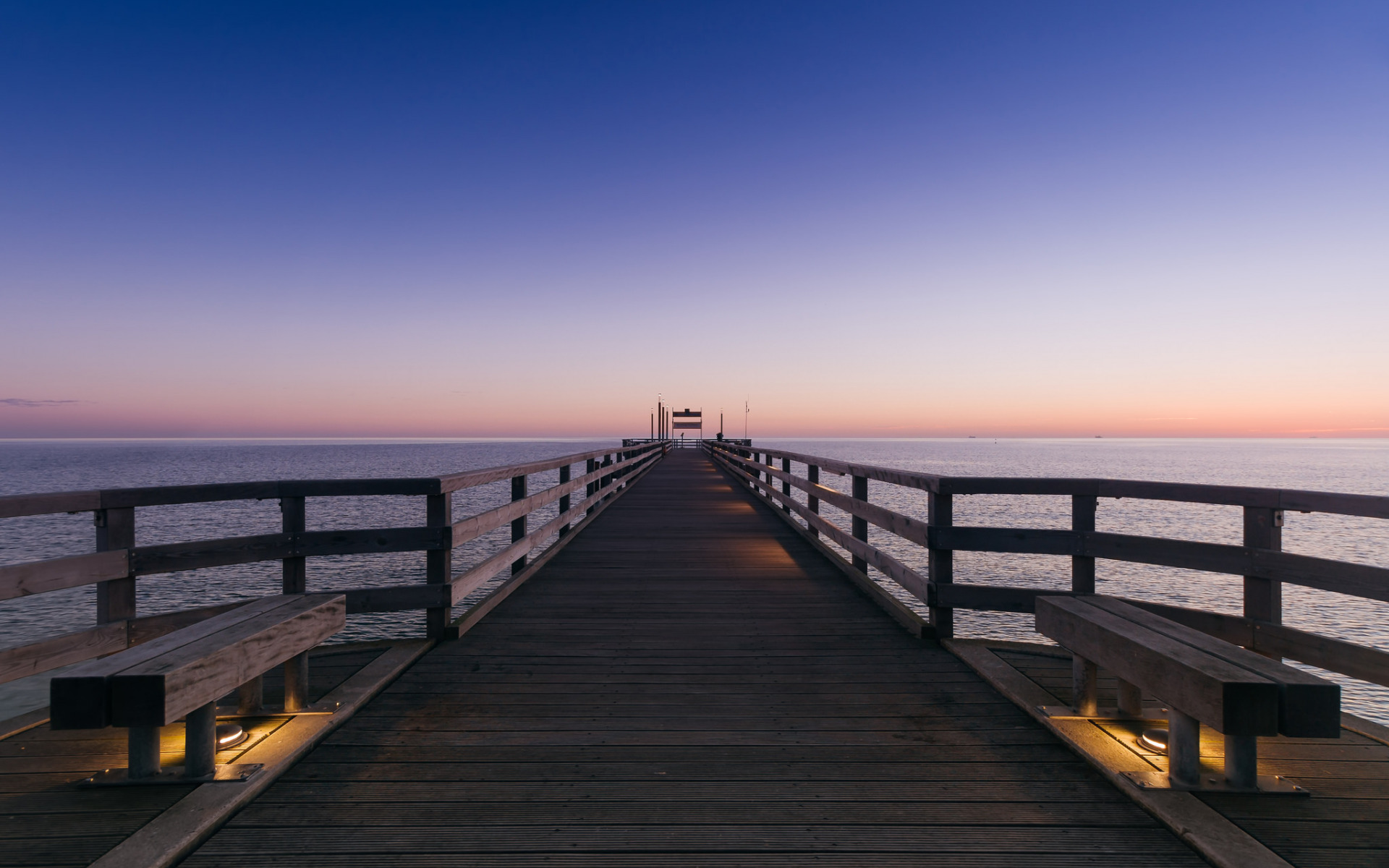 Description: A long pier with benches on it at dusk over the ocean with lights on the end of the pier.